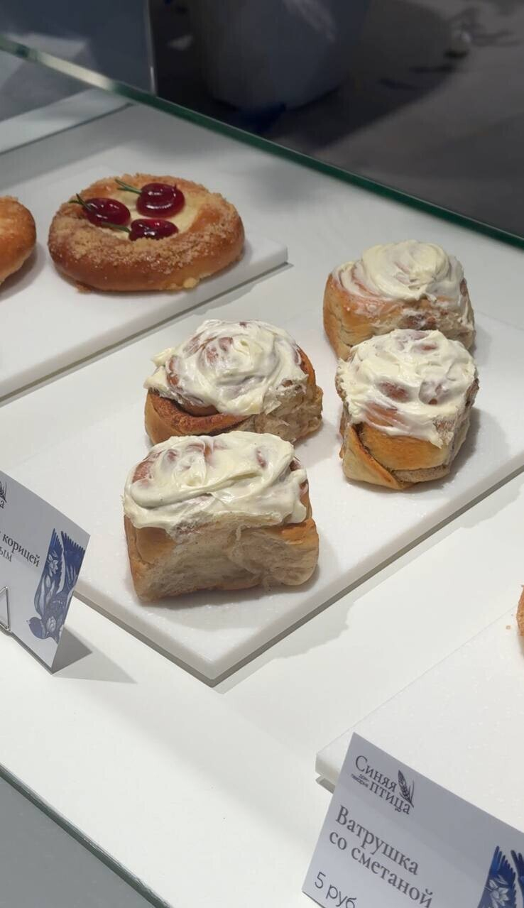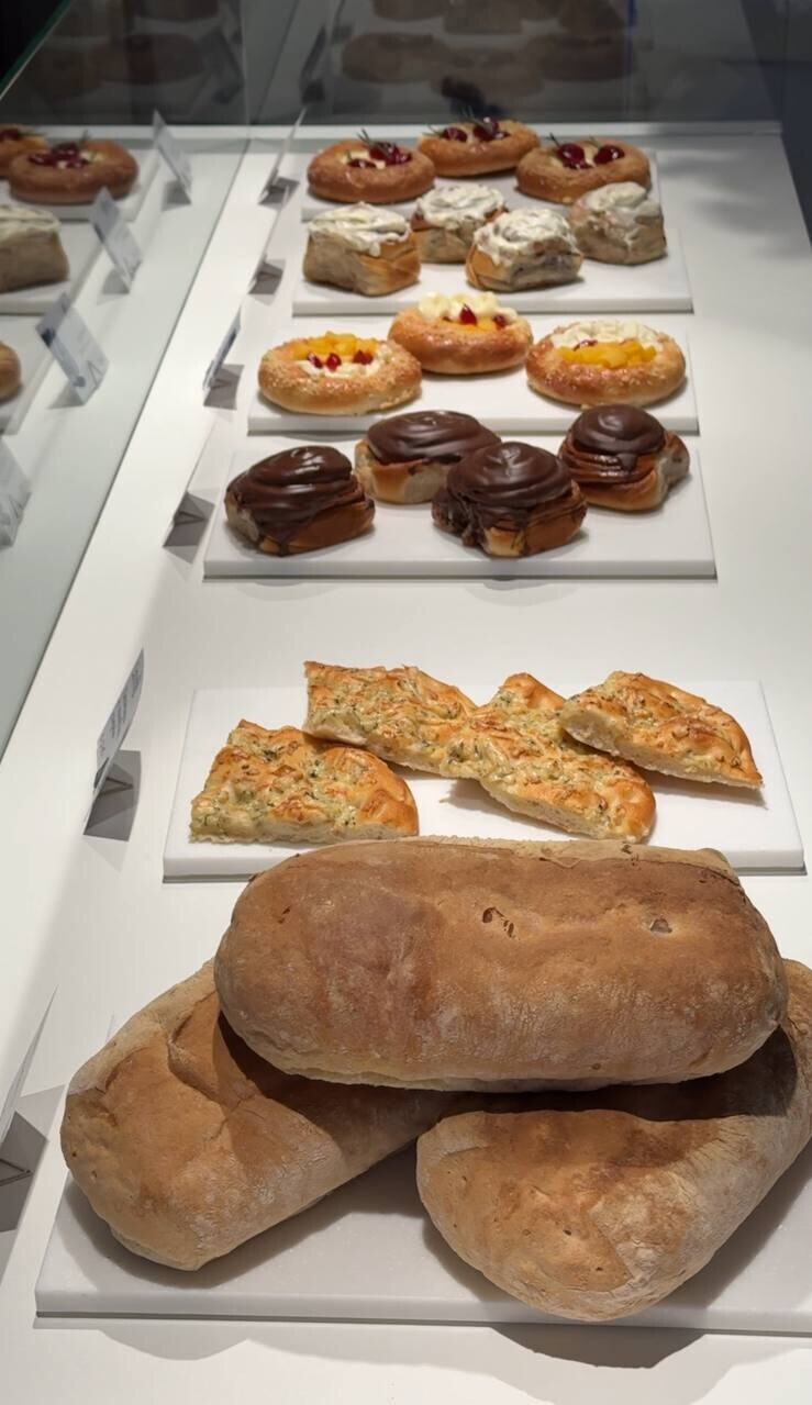Булочки стоят по 4-5 руб.: с корицей и сливочным кремом, с вишней, со сметаной, с шоколадом и корицей. Также можно захватить с собой чиабатту, багет на закваске или лепешку с голубым сыром. Цены на кофе средние по городу: 7-9 руб.