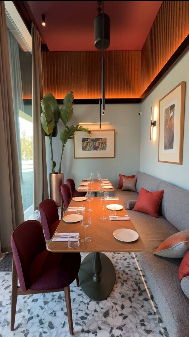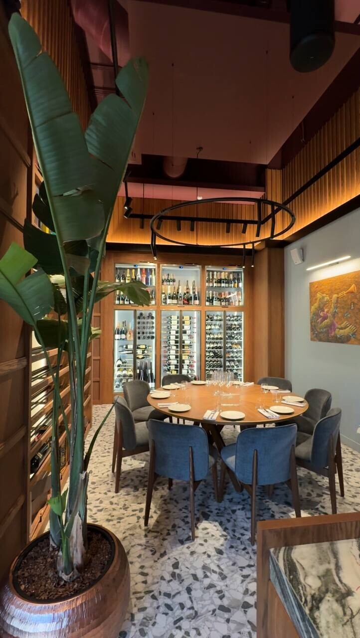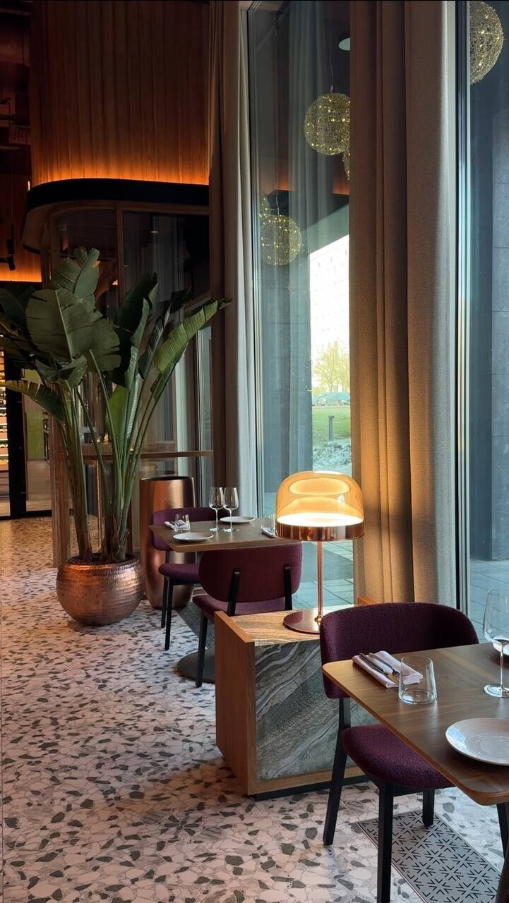 Интерьер можно назвать современной классикой, но с явными авторскими акцентами. Самые цепляющие элементы — витиеватые медные светильники и удачно подобранные картины, которые придают залам характер. Эффектно выглядит шкаф с декантерами разной формы. Также в помещениях много зелени и дерева. Цветовая палитра нейтрально теплая, обволакивающая, не отвлекающая от главного — тарелки и бокала.