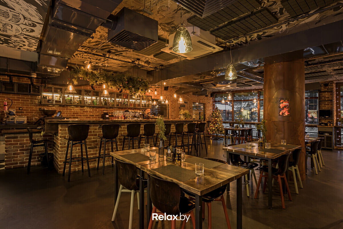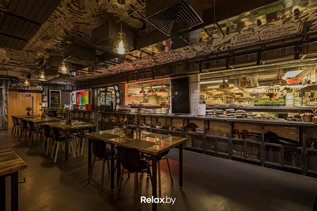 Из домика пиццайоло возвращаемся в ресторан. Зал достаточно просторный: ламповый желтый свет, панорамные окна, посадка на любой вкус (высокая, низкая, у бара). Много дерева, металла, кирпича и, конечно, отсылок к культовому произведению «Скотный двор» Джорджа Оруэлла (например, в виде росписи потолков). Но главный акцент зала, на наш взгляд, — открытая кухня.
