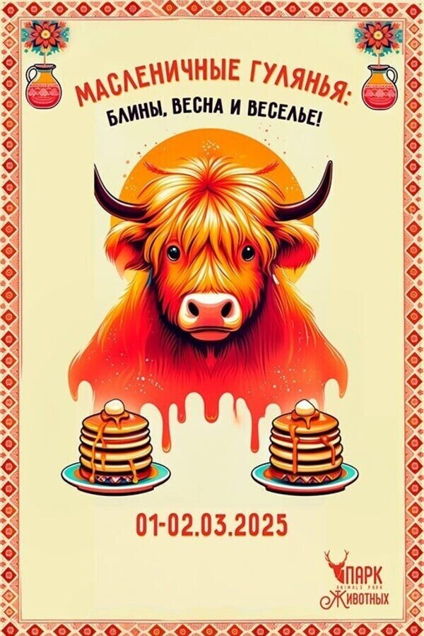 Обязательно приезжайте в парк заранее, чтобы успеть погулять! Здесь огромная территория, на которой комфортно проживает огромное количество животных. Вам обещают вкусные блины, масленичные игры (блинная эстафета, метание валенка, мастер-класс по изготовлению блинов), сжигание чучела (хороводы) и атмосферу настоящего праздника.