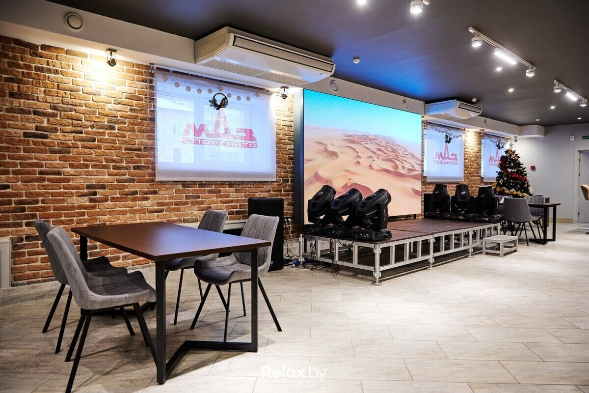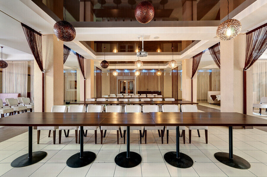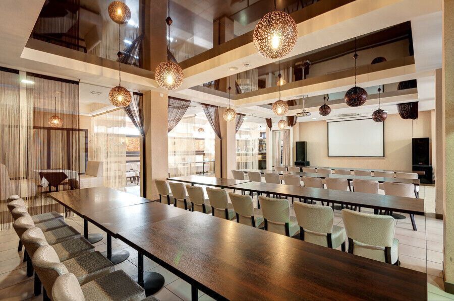 - банкетный зал оборудован сценой, барной стойкой, chillout зоной, аэрохоккеем, проектором с экраном, круглыми столами и стульями, пледами и зонтиками;