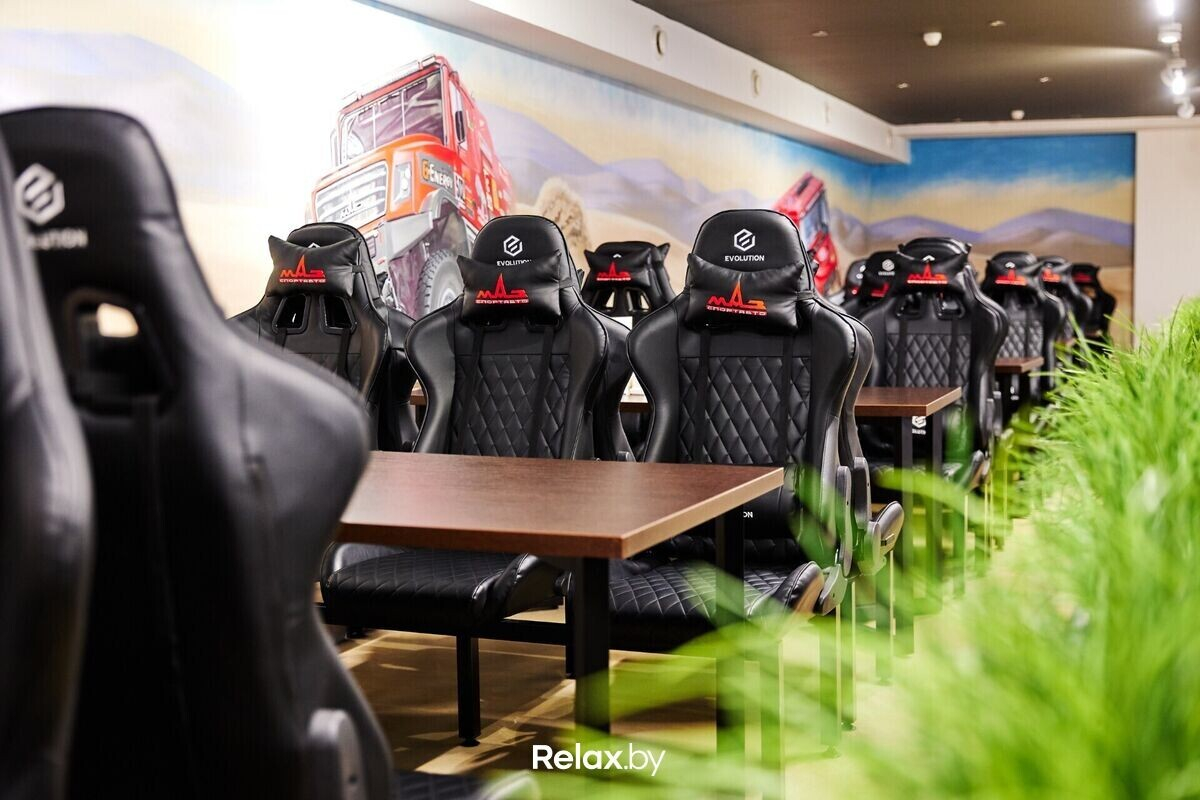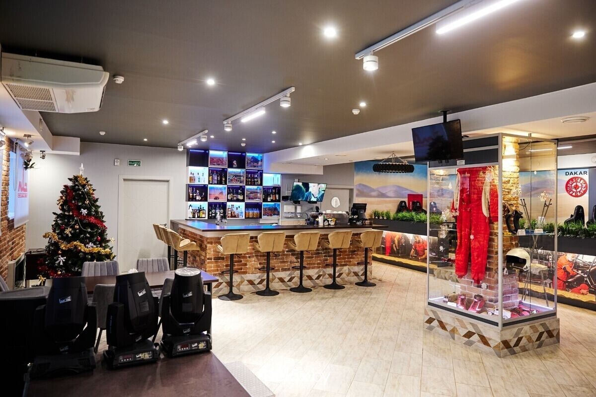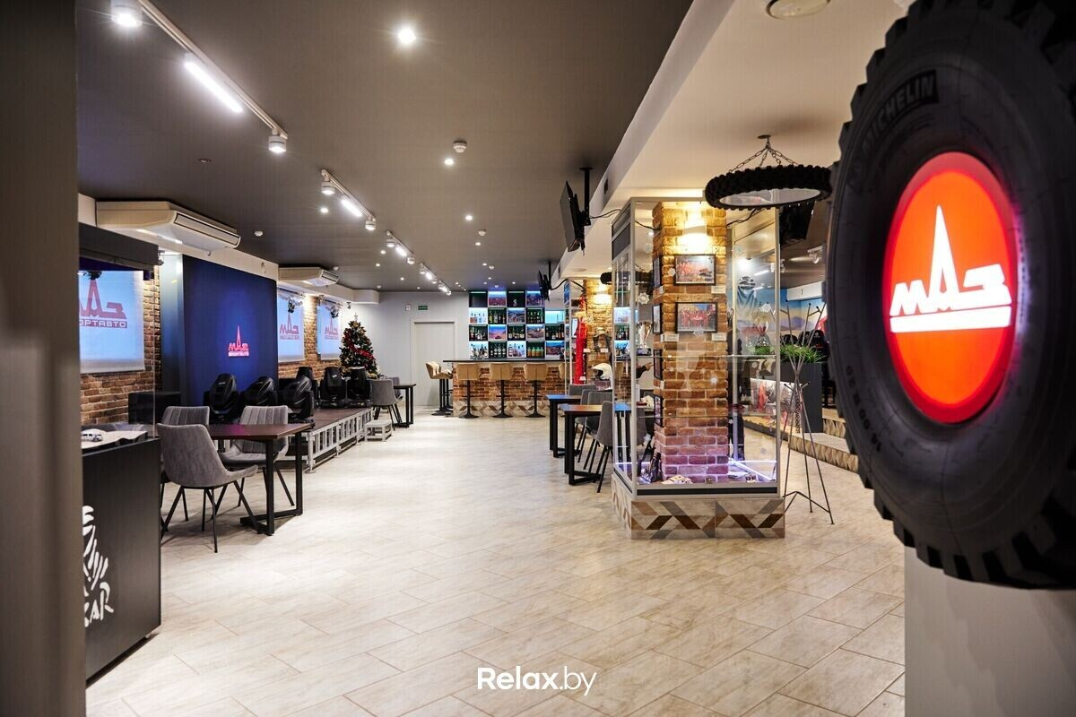 Интересно, что здесь все стилизованно под «Дакар»: вы увидите стулья в виде гоночных кресел, тематические граффити на стенах, многочисленную атрибутику (кубки, медали, образцы спортивной одежды с минувших спортивных состязаний). На входе — оригинальное колесо грузовика, принимавшего участие в ралли-рейде.