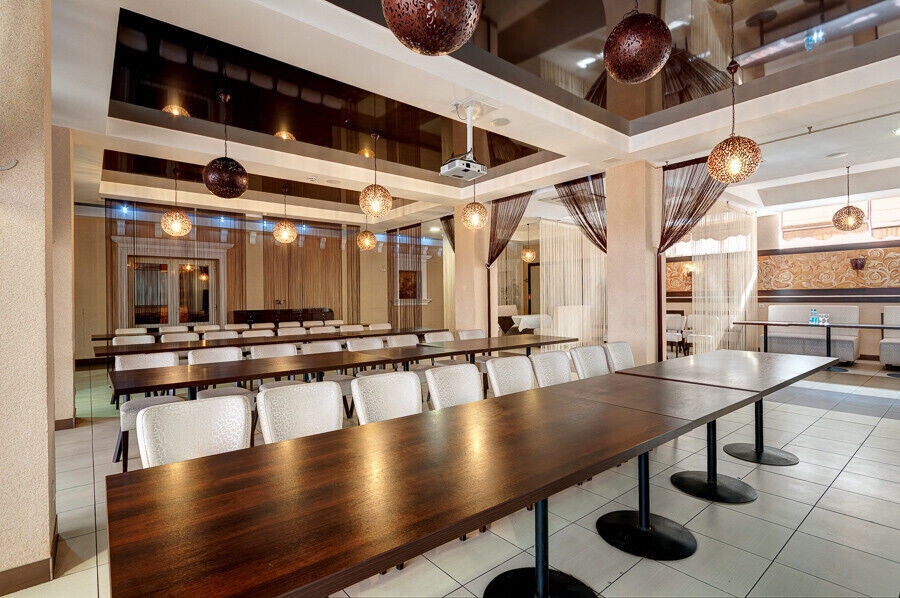 Залы могут подстроиться под любую праздничную тематику, потому что в интерьере спокойные бежево-шоколадные тона и акцентные светильники. Меню представляет собой органичное сочетание европейской кухни с изюминкой в виде авторских блюд. Стоит отметить, что здесь готовят вкусные стейки с полезными гарнирами. В формате выпускного заведение готово вместить до 150 гостей.
