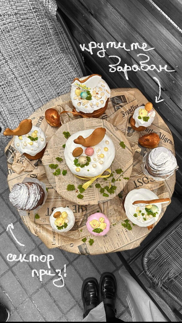 - Кулич заварной с дубайской начинкой с яйцом с предсказанием (внутри можно найти скидку на заказ кофе) (400 г, 47 руб.);