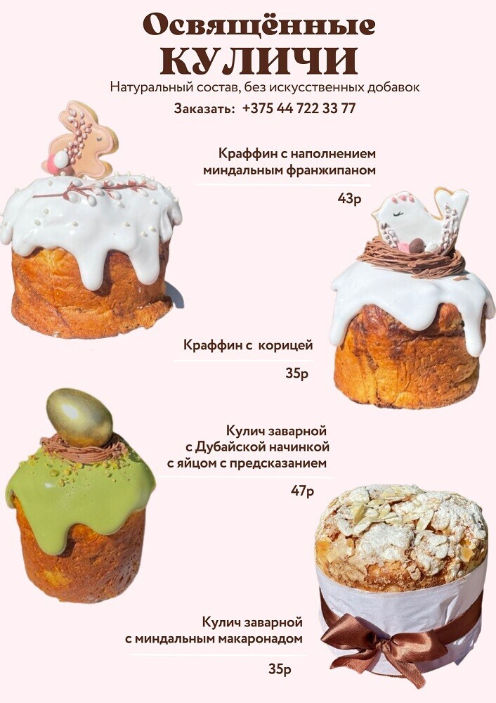 Забронировать куличи можно по номеру телефона +375 (29) 178 00 88 или в директ Instagram