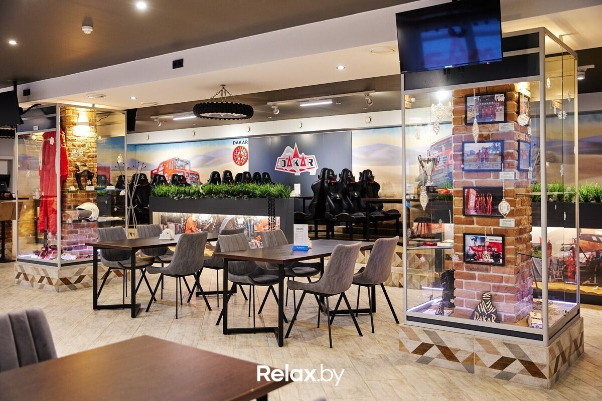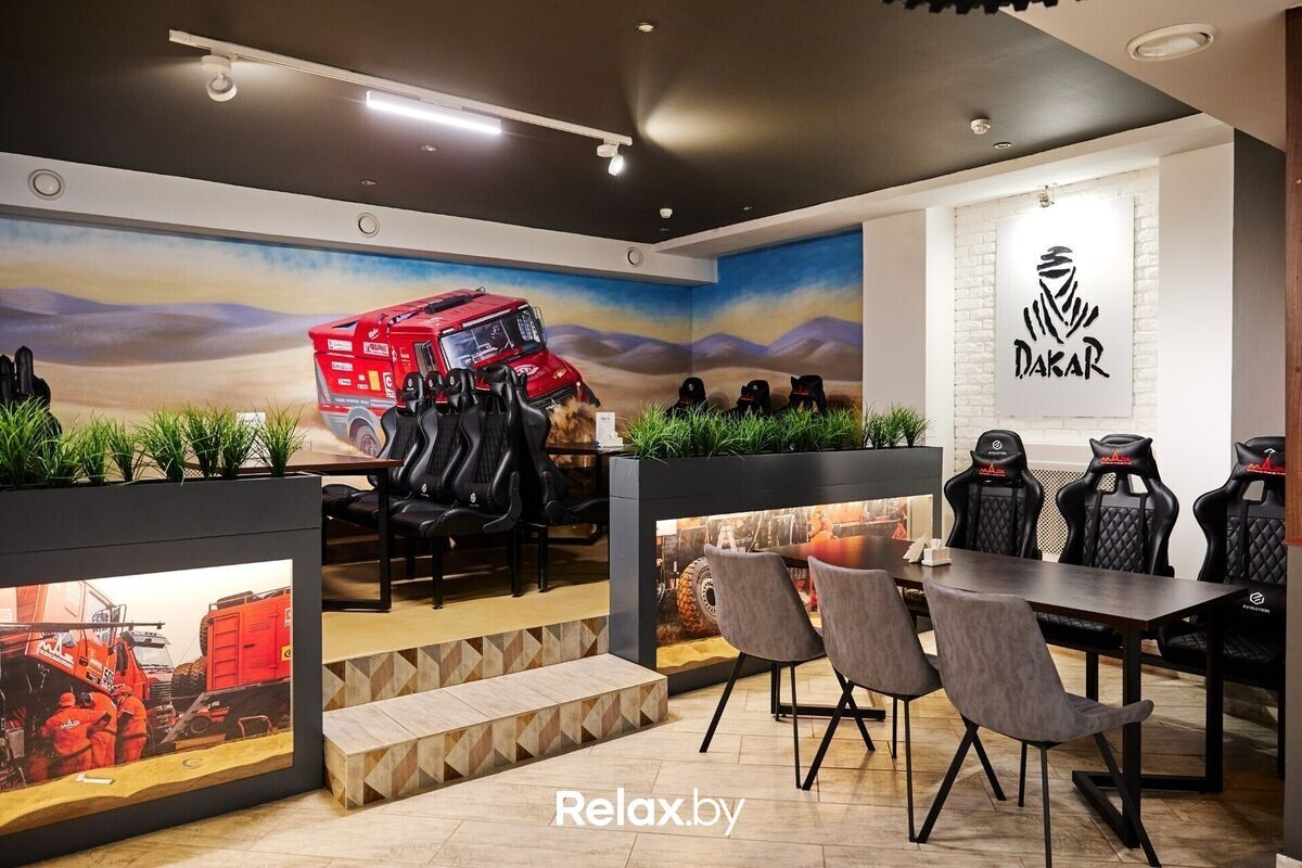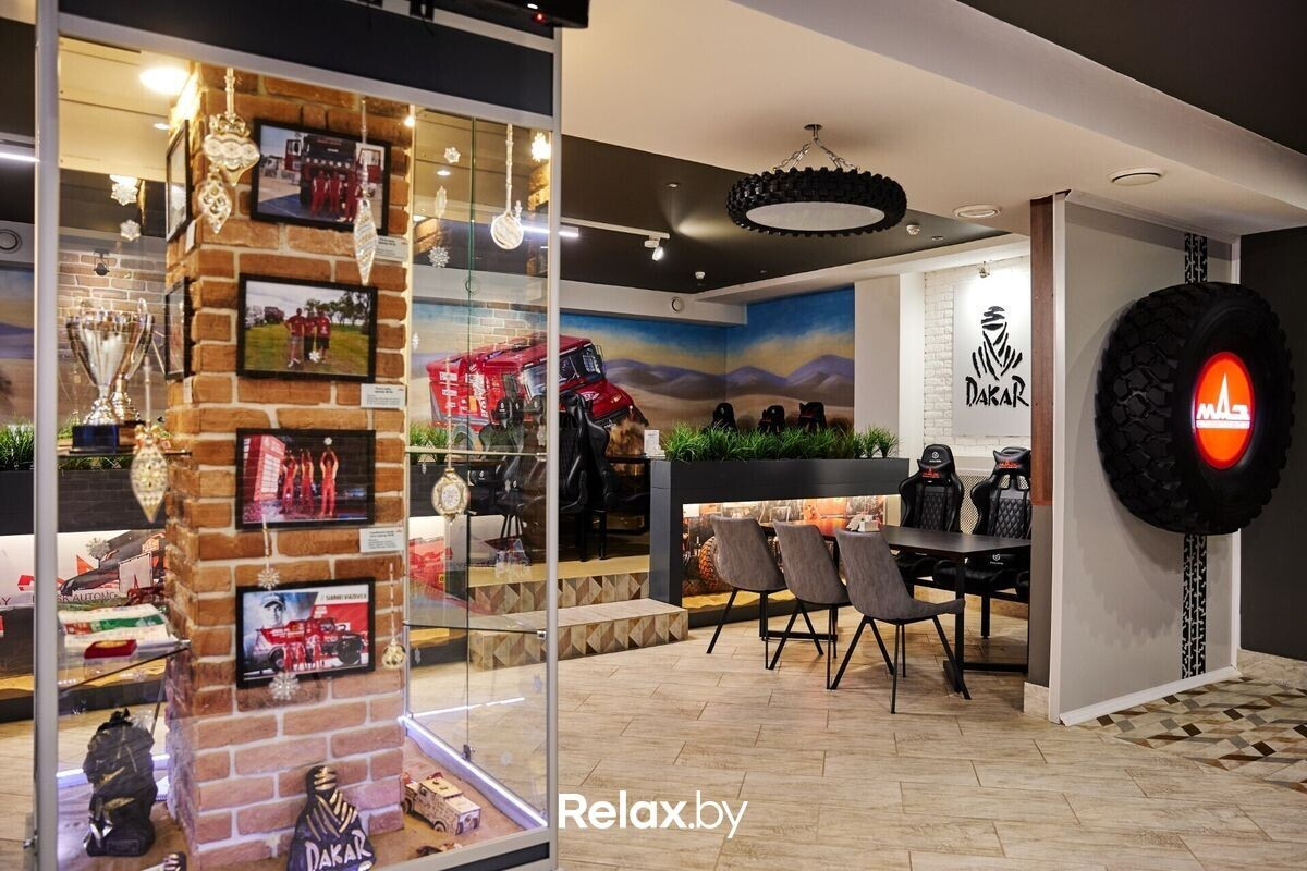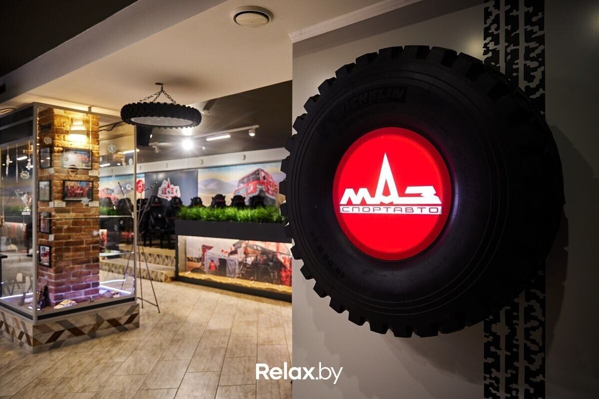 Обязательно стоит рассказать про интерьер: здесь все стилизованно под «Дакар». Пожалуй, главная особенность — стулья в виде гоночных кресел. Также стоит отметить тематические граффити на стенах и многочисленную атрибутику — кубки, медали, образцы спортивной одежды с минувших спортивных состязаний. А на входе можно заметить оригинальное колесо грузовика, принимавшего участие в ралли-рейде.