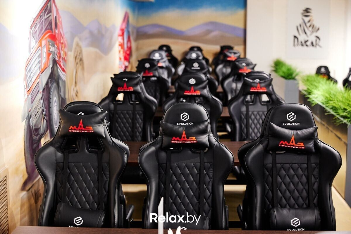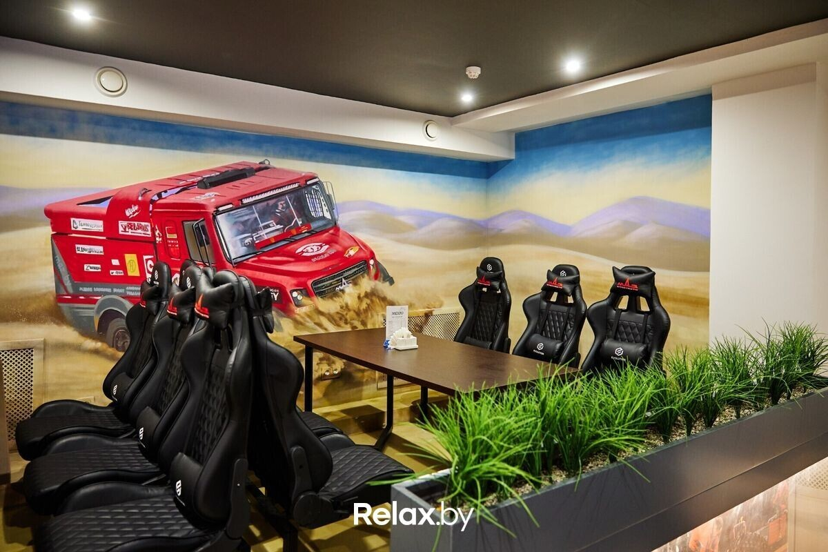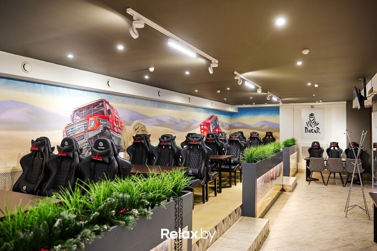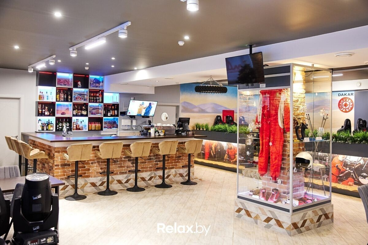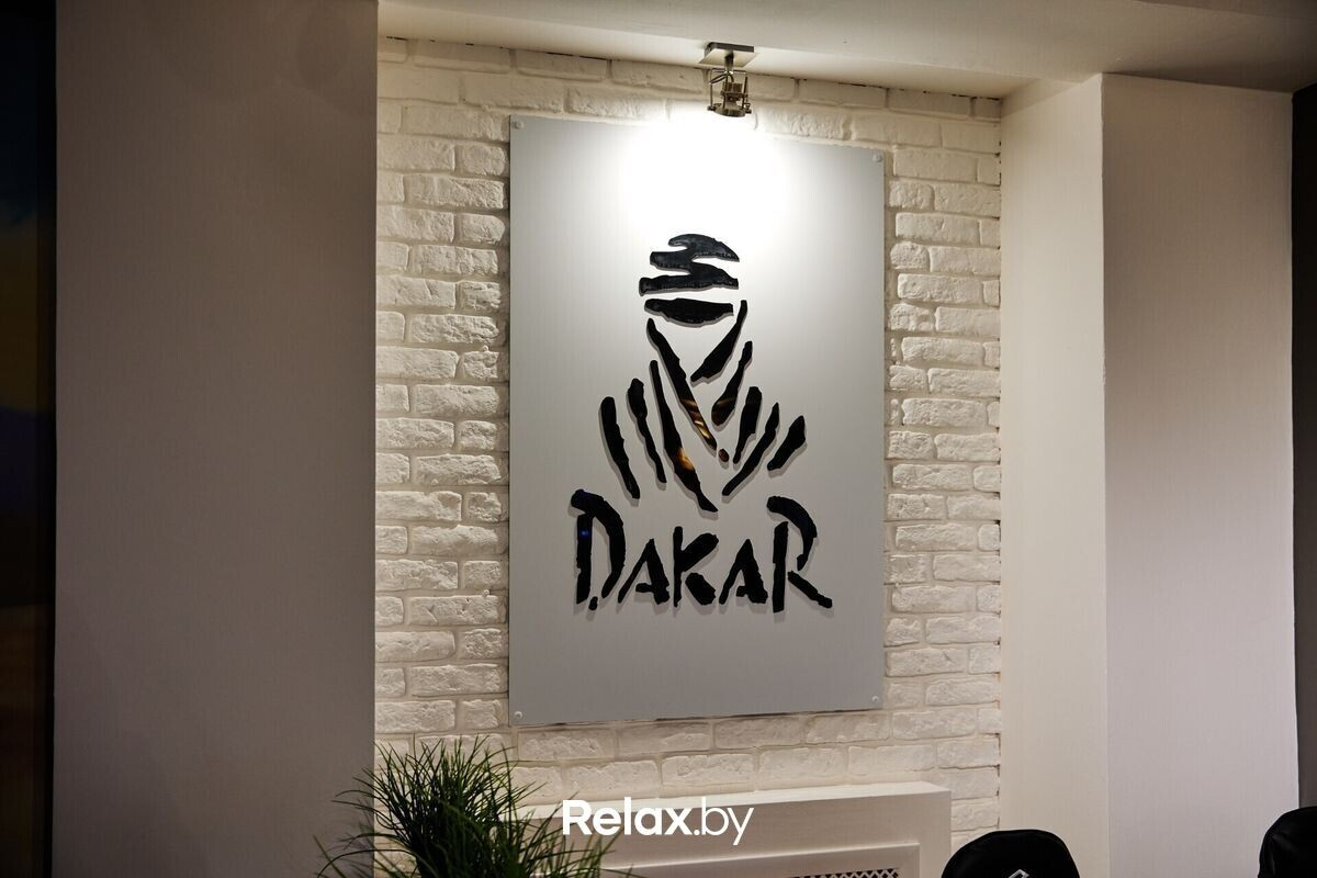 Обязательно стоит рассказать про интерьер: здесь все стилизованно под «Дакар». Пожалуй, главная особенность — стулья в виде гоночных кресел. Также стоит отметить тематические граффити на стенах и многочисленную атрибутику — кубки, медали, образцы спортивной одежды с минувших спортивных состязаний. А на входе можно заметить оригинальное колесо грузовика, принимавшего участие в ралли-рейде.