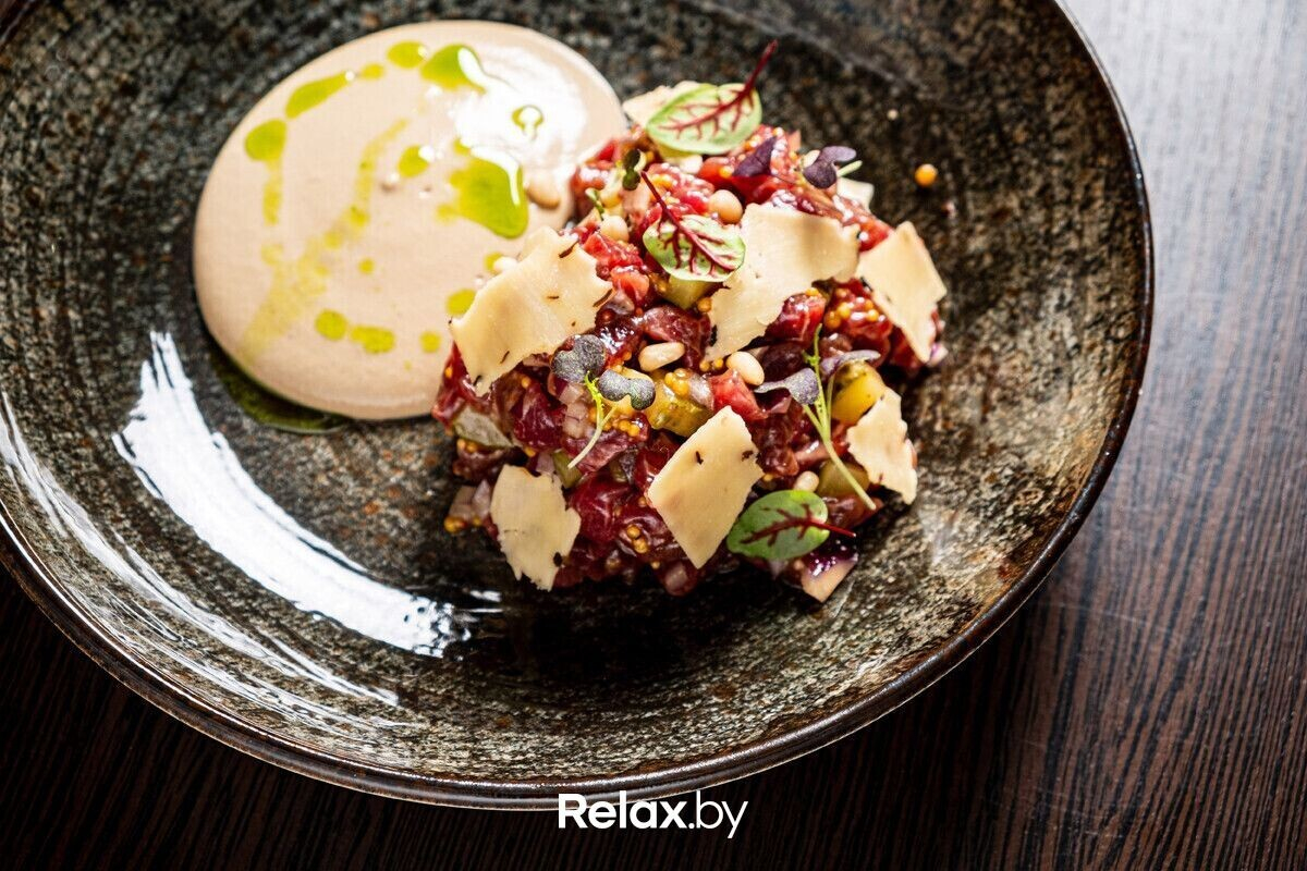 В меню МАЗ-Dakar преимущественно блюда европейской кухни, в основном хорошо знакомые нам позиции, но в авторском прочтении шеф-повара. Найдете любую позицию на свой вкус: от понятного сытного бургера до изысканного тартара. К слову, среди бургеров рекомендуем выбрать фирменный — его небанально подают с «сырной вакциной». Отдельной категорией стоит отметить закуски к пенному: от большого плато до сета колбасок. Также можно заказать пивные гренки с халапеньо и двумя видами сыров, куриные наггетсы и гриль-миксы для него и для нее.