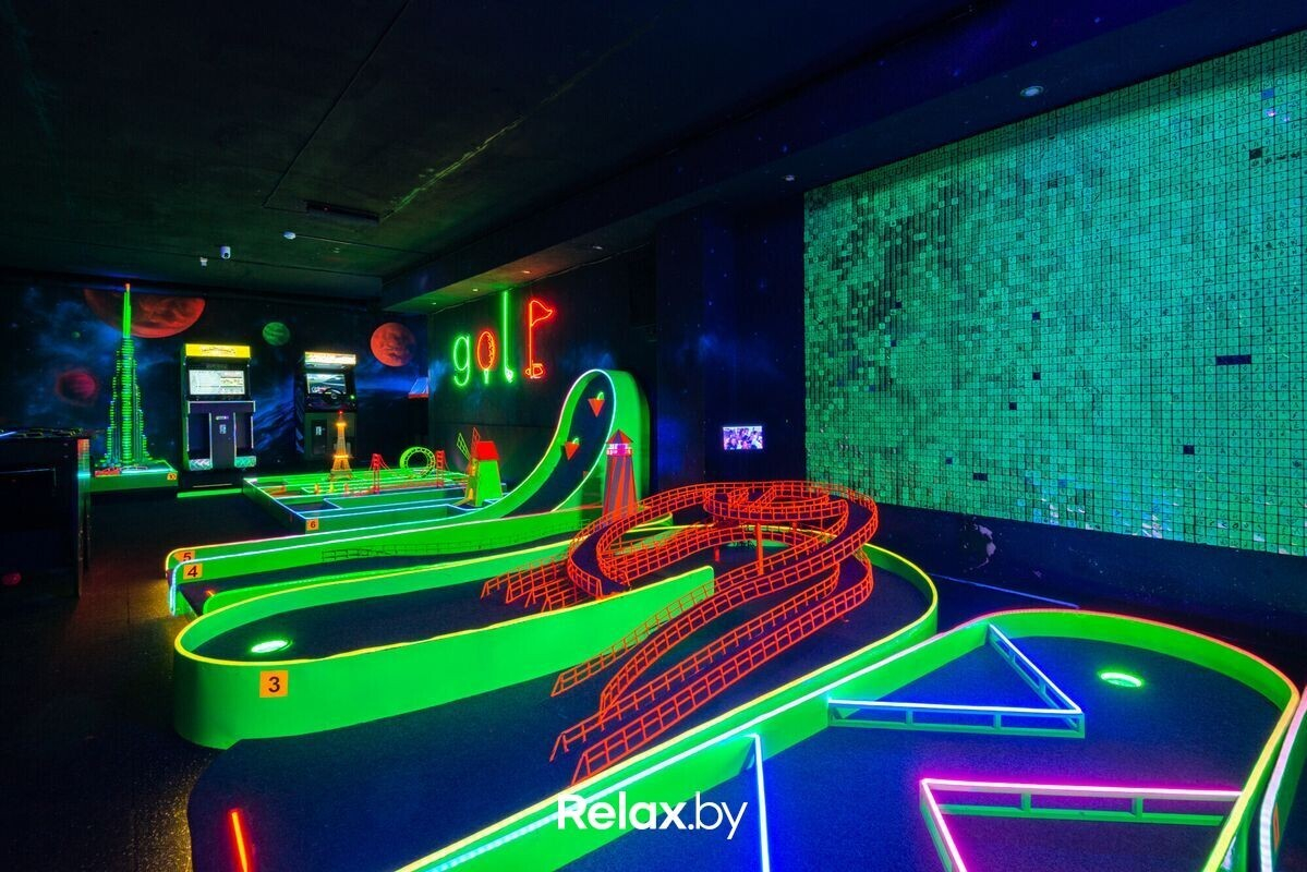 Но дело не только в гольфе. Вас ждет сухой бассейн, аэрохоккей, караоке-будка (идеально, если в вас живет скрытая поп-звезда), гонки на симуляторе и, конечно, неоновая фотозона для десятка эффектных кадров.