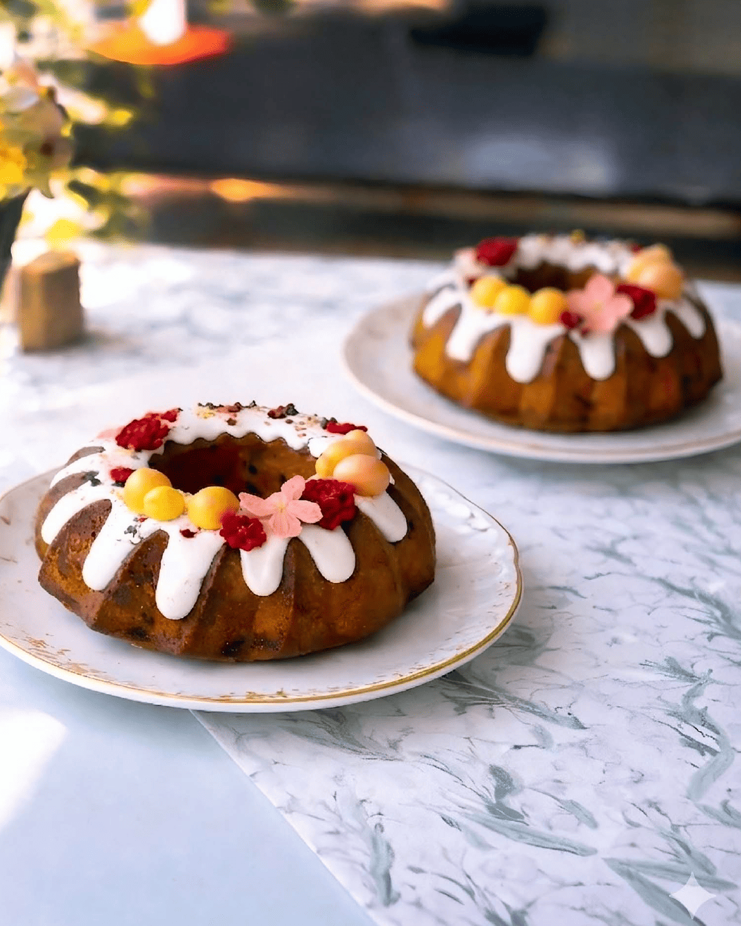 Кулич с клюквой, украшен сахарной глазурью и икрой из яблочного сока.