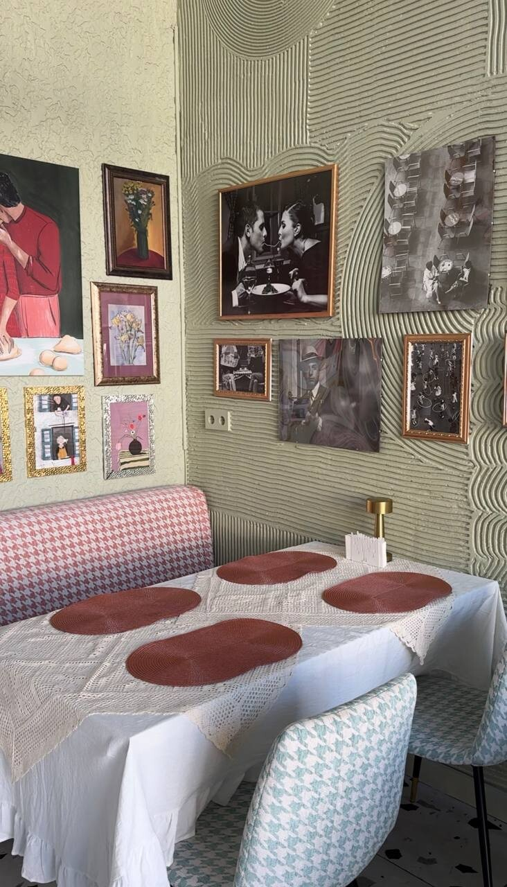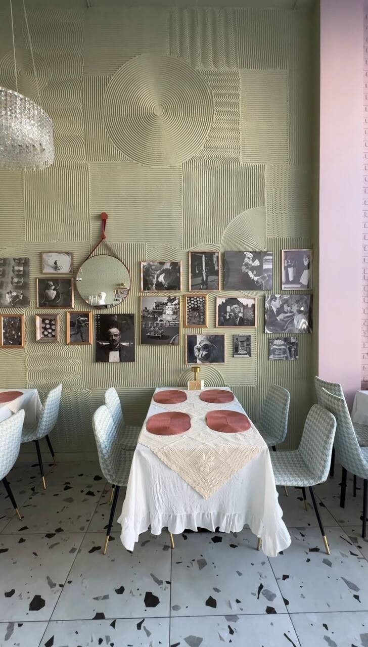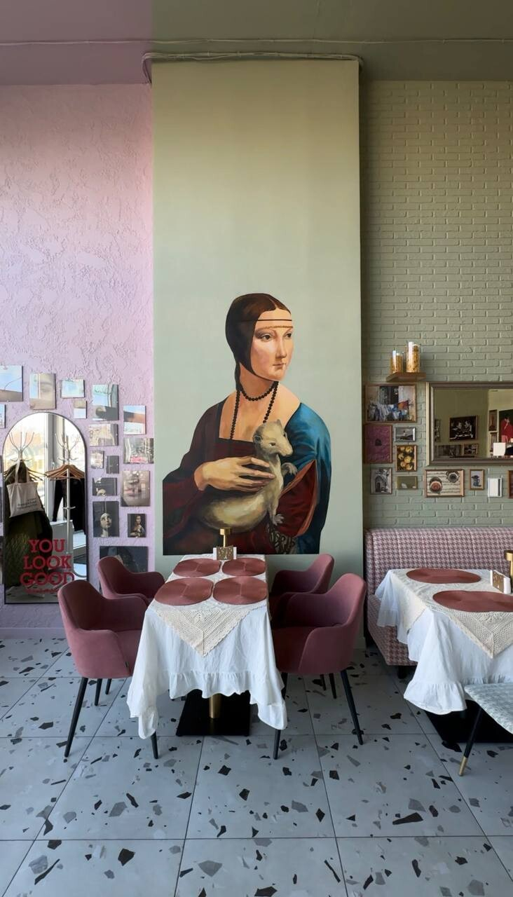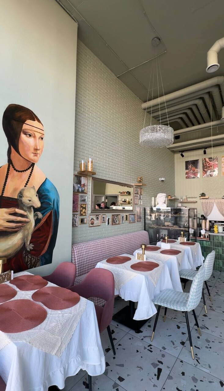 Пространство бистро — один общий просторный зал с высокими потолками. Акцент сделали на домашний итальянский уют с обилием милых деталей, которые хочется рассматривать. Все эти кружевные скатерти, обилие зеркал в массивных рамах, старые фото… Одну из стен украшает «Дама с горностаем» — говорят, писал известный местный художник.