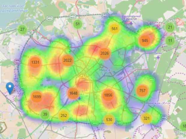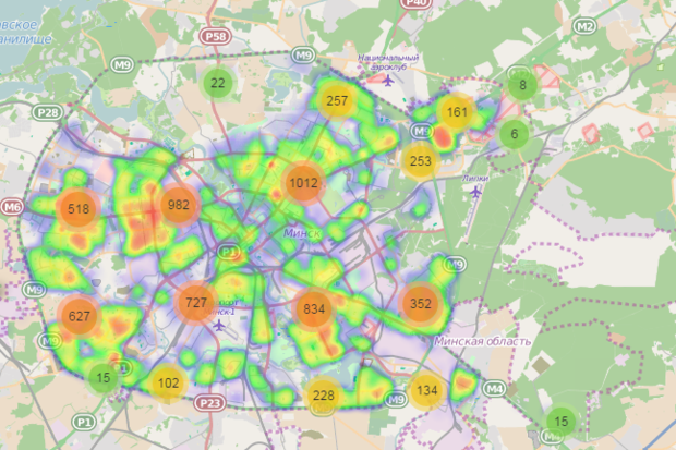 Новая карта тоже охватывает весь Минск, только показывает уже данные МЧС о пожарах за последние четыре года: чем темнее пятно на карте, тем опаснее область, им помеченная. Причем попали на карту не только пожары, но и другие происшествия, с которыми справлялась бригада МЧС. Смысл продукта в том же: помочь людям при выборе недвижимости. Если вы видите, что в доме было три пожара, подумаете, стоит ли покупать или снимать такое жилье.