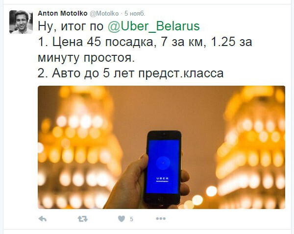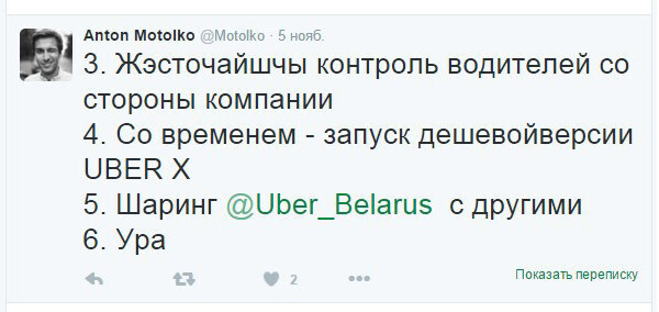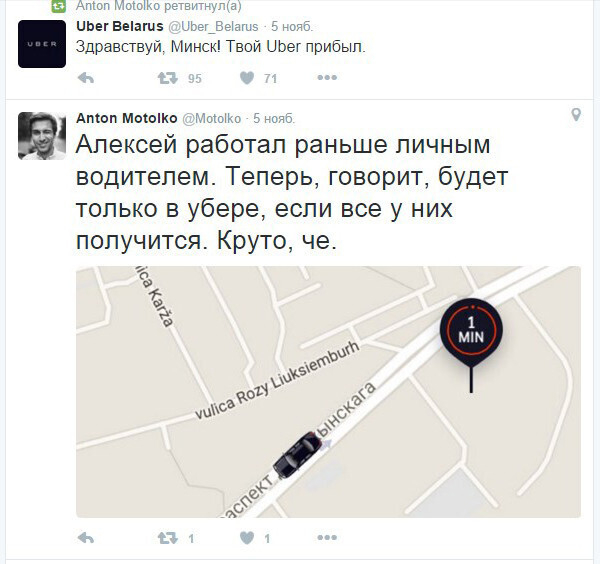 «Uber нужен Минску как воздух, потому что в основной своей массе соответствующие службы возят людей на плохих машинах, водители часто хитрят с ценами, а уровню сервиса в целом есть куда расти. Если Uber действительно пришел в страну надолго и начнет работать в полную силу, то задаст определенный уровень для всей отрасли. Окончание эры шансона в салонах и выключенных счетчиков близко как никогда!