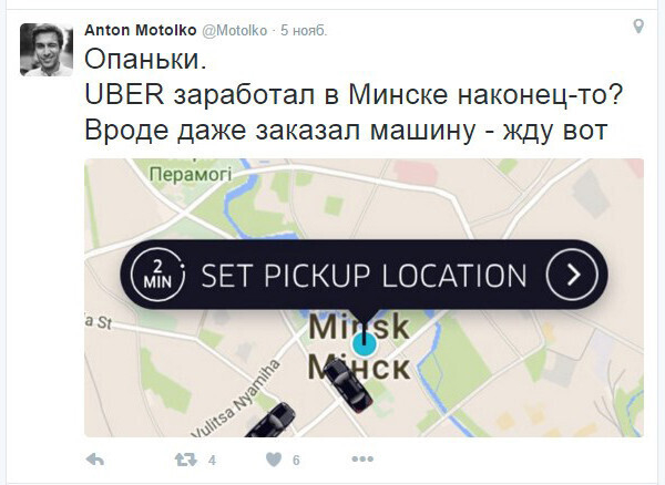 Вчера в Минске неожиданно заработал всемирно известный сервис Uber. Уже опробовавшие говорят, что машины — премиум, водители — вежливые, приложение — качественное, списание денег с карточки — четкое. Было заявлено, что в Минске пока будет работать только UberBLACK (авто премиум-класса по соответствующей стоимости). Когда здесь появится дешевый Uber для простого белоруса, пока неизвестно. Relax.by заинтересовался, как оценили поездку первые пользователи.