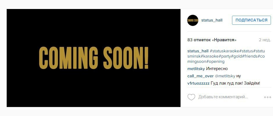 Те, кто любит петь, получат в новом заведении удовольствие: по словам создателей, за входными дверьми «Статуса» — модный клуб с отличным оснащением, достойным бэк-вокалом и вкусной едой. Кстати, здесь будет аллея славы, куда смогут попасть самые артистичные гости.