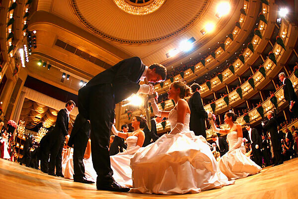 Дамам, естественно, положено быть в платье. Причем, появиться на балу в одном и том же дважды — дурной тон. Выбирая платье, девушка должна подумать в первую очередь об удобстве, своем и окружающих. Если она собирается танцевать, то слишком объемное платье может стать помехой, а обувь на шпильке лучше оставить дома, идеально подойдут балетки или туфли на низком каблуке.