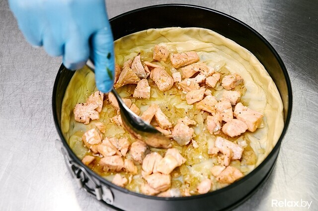 Семгу предварительно нужно либо отварить, либо обжарить. Эту рыбу — самый дорогой ингредиент — можно заменить любой другой. Поверх рыбы и лука выливаем нашу смесь.
