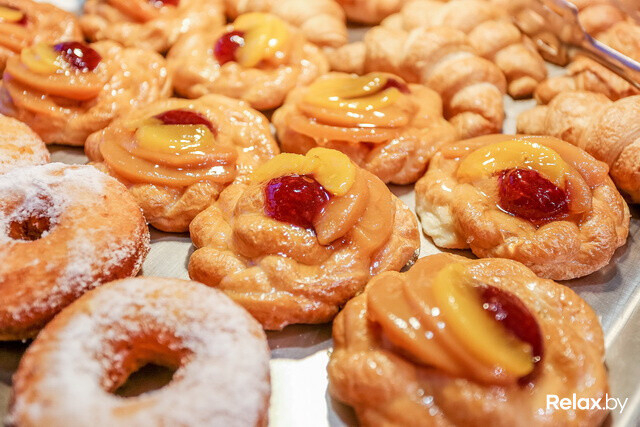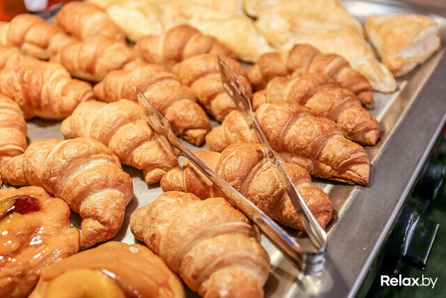 Идем дальше. Собственное производство позволяет каждое утро выставлять на столы нежнейшую и свежайшую выпечку: круассаны, дэниши, пончики, сметанники, чиабатта, обычный и тостовый хлеб.
