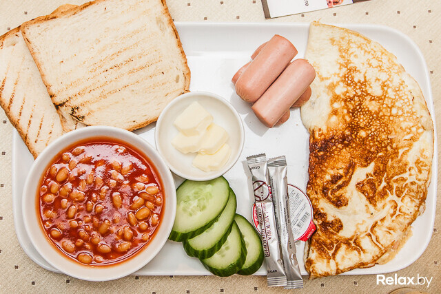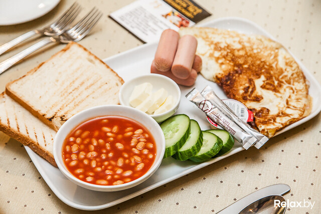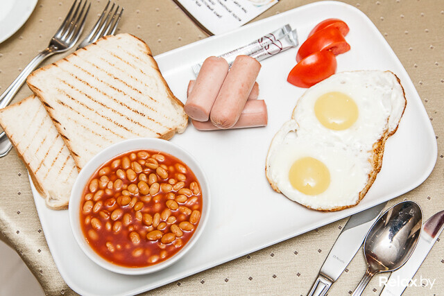 В «Английском» завтраке глаза увидят, а вкусовые рецепторы прочувствуют омлет с сыром и ветчиной, отварные сосиски, фасоль в томатной пасте, свежий огурец, жареный тостовый хлеб, джем или сливочной масло, сок или питьевую воду, круассан с шоколадом и кофе либо чай.