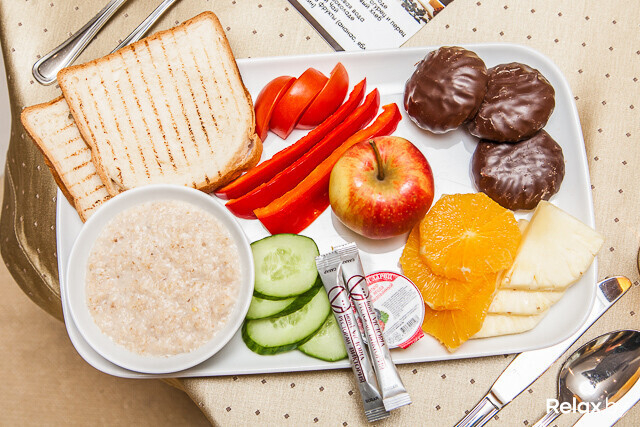 «Вегетарианский» предлагает зарядиться энергией, позавтракав овсяной кашей, свежими овощами и фруктами, тостами и джемом, зефиром в шоколаде с чаем или кофе.