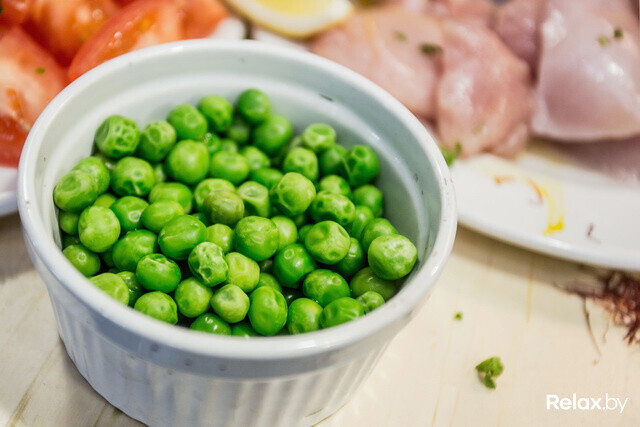 Контрастом по цвету на нее ложится зеленый горошек. Несколько минут спустя добавляются курица и креветки.