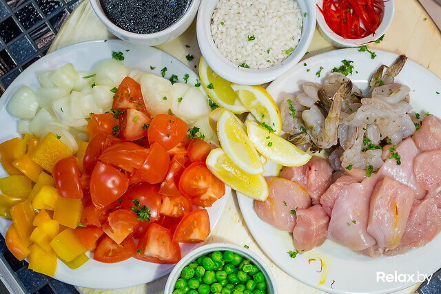 В составе паэльи — типичный для Испании набор ингредиентов: рис, томаты, лук, горошек, зелень, креветки, филе цыпленка, лимон. Эффектности ему добавляют перец чили и чернила каракатицы.
