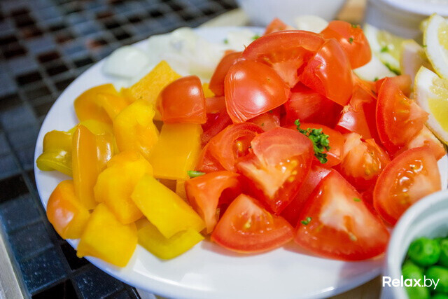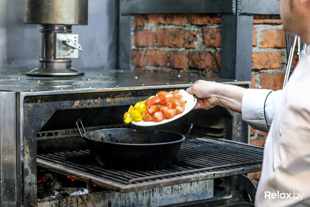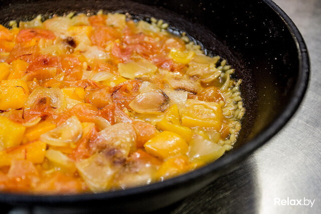 Вначале в разогретую на углях сковороду отправляются овощи — паприка и томаты. Позже к ним присоединяются лук, рис арборио и бульон.