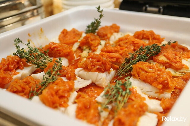 Треску в красном маринаде особенно оценили гости: ее разобрали очень быстро. Необычна подача картошки: она готовится с розмарином и томатами черри. Есть в меню и террин из баклажанов и цукини, колбаски.