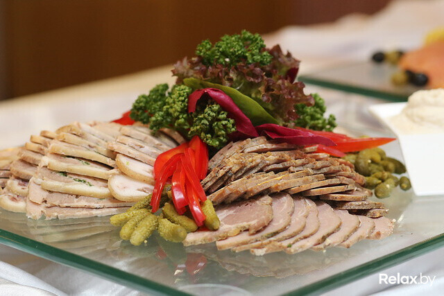 Разнообразна мясная нарезка: это и буженина, и сыровяленая колбаска, свиные ребрышки, рулька, мясные рулетики с разными начинками и язык.
