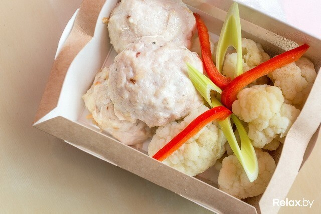 Обед в этом сете как нельзя лучше подойдет худеющим: овощной суп с фрикадельками из мяса индейки, паровые тефтели из цыпленка и отварная цветная капуста — легко, полезно и вкусно.
