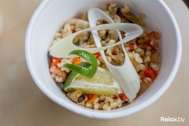 Обед: Уха по-домашнему, плов из булгура с морским миксом (кальмар, мидии, креветки), микс-салат с томатами черри