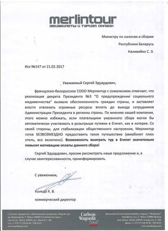 — Письмо не должно восприниматься как поддержка нового Декрета. И это не мы придумали, государство первое начало. Данное абсурдное предложение как ответ на абсурдные законы. У меня жена с тремя детьми получила «письмо счастья», так что я тоже заинтересован в отмене сбора. Но это же не повод не относиться к нему с юмором?