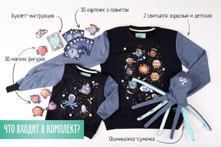 Одежда, которая позволяет изучать с ребенком счет, цвета, развивать мелкую моторику. Космическая тематика позволит всей семье отправиться в захватывающее путешествие и познакомиться с солнечной системой. В комплекте идут сменные элементы, а также буклет с развивающими играми. Подробности