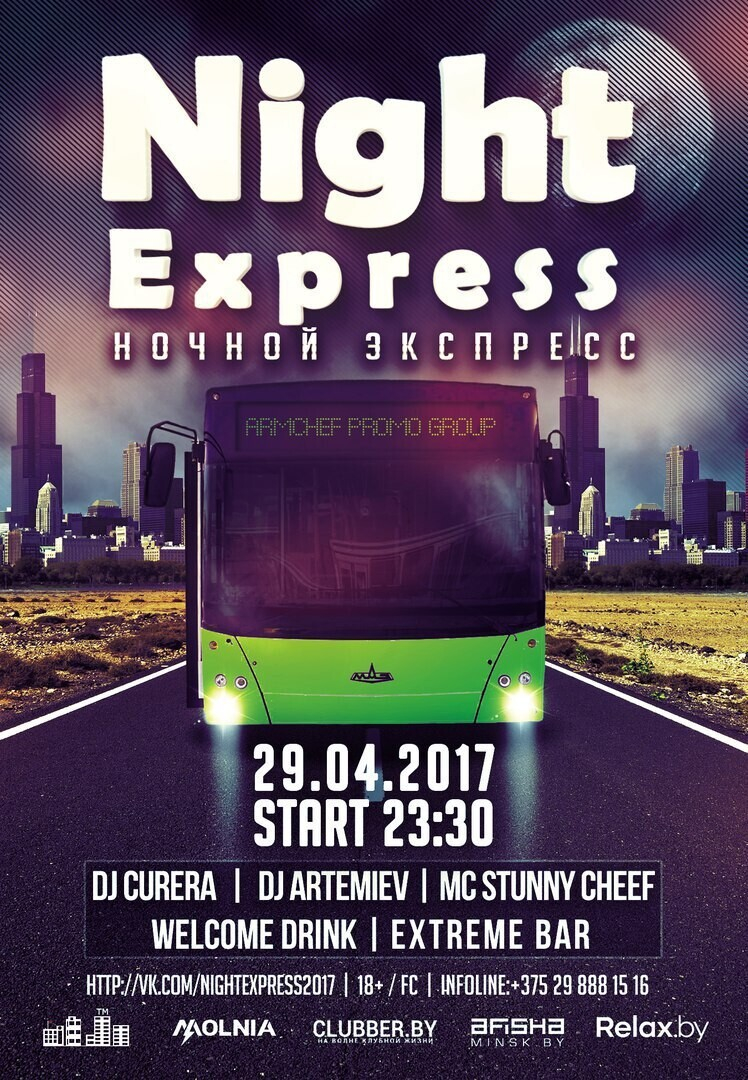 Ночной экспресс начнет свой маршрут в субботу, 29 апреля, в 23:30 возле ст.м. «Могилевская», проедет по «самым жарким местам Минска», после чего отправится за город и вернется в пункт отправления в воскресенье, в 5:00 утра. На борту автобуса гостей будет ждать полноценный клуб: 1,5 кВт света и звука, диджеи, МС, фото- и видеооператоры, а также два бара с напитками.