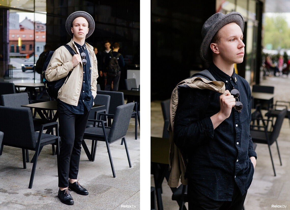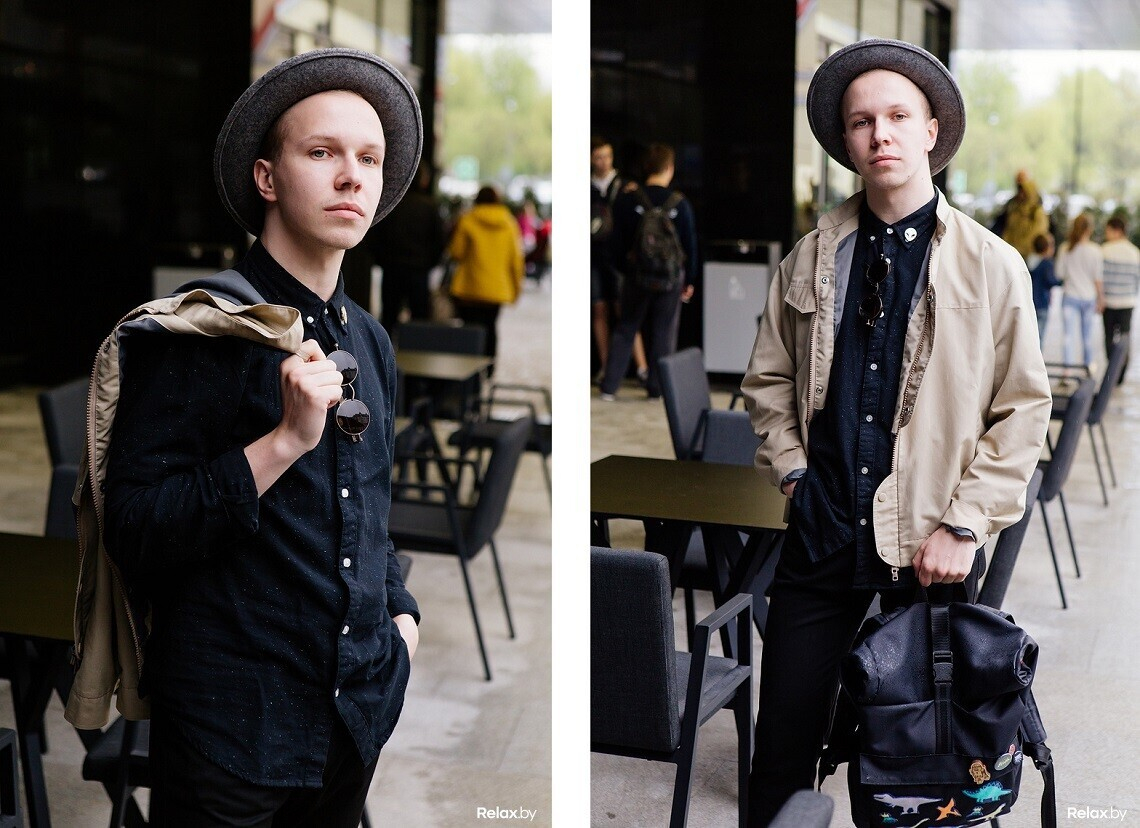 — Сегодня на мне джинсы Wrangler; у меня трое штанов этого бренда, очень удобные и качественные, все были куплены в секонд-хендах и стоили не больше 10-15 рублей. Рубашку я покупал недавно в Таллине в магазине NewYorker за 13 евро. Значок с инопланетянином — подарок подруги-путешественницы. Куртка — из 90-ых, а винтажная шляпа Аtlas нашлась в «секонде» Вильнюса.