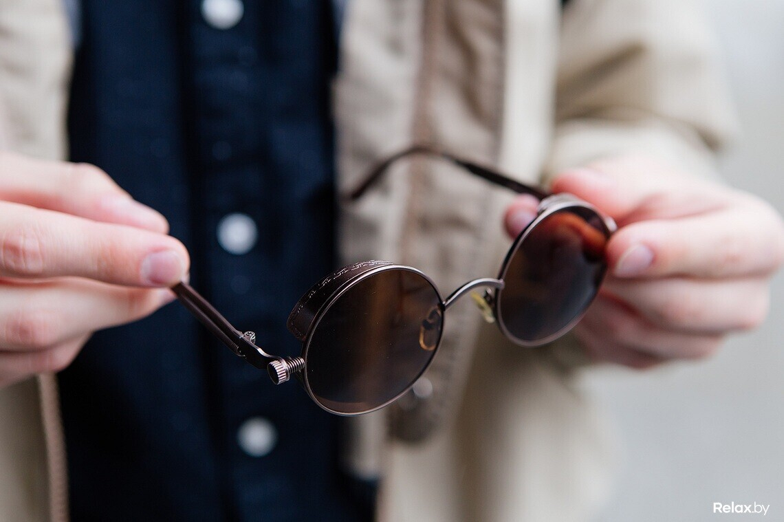 На ногах — винтажные немецкие дерби Lloyd, которые я купил тоже в «секонде» 3 года назад всего за 6 рублей. Носки нашел в Mark Formelle (я большой любитель веселых носков с принтами; обычно покупаю их, когда путешествую, или друзья из разных стран привозят). Рюкзак новый, шился на заказ (с детства обожаю динозавров). Все, что на нем, куплено в минском магазине комиксов time to be a hero. Очки давно встретил в ТЦ «Силуэт».