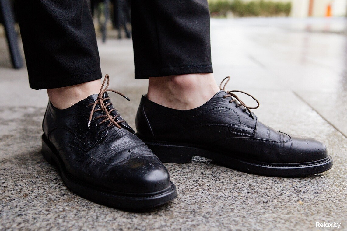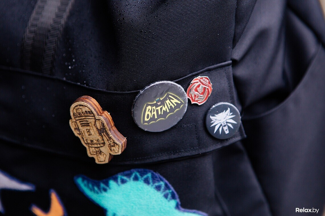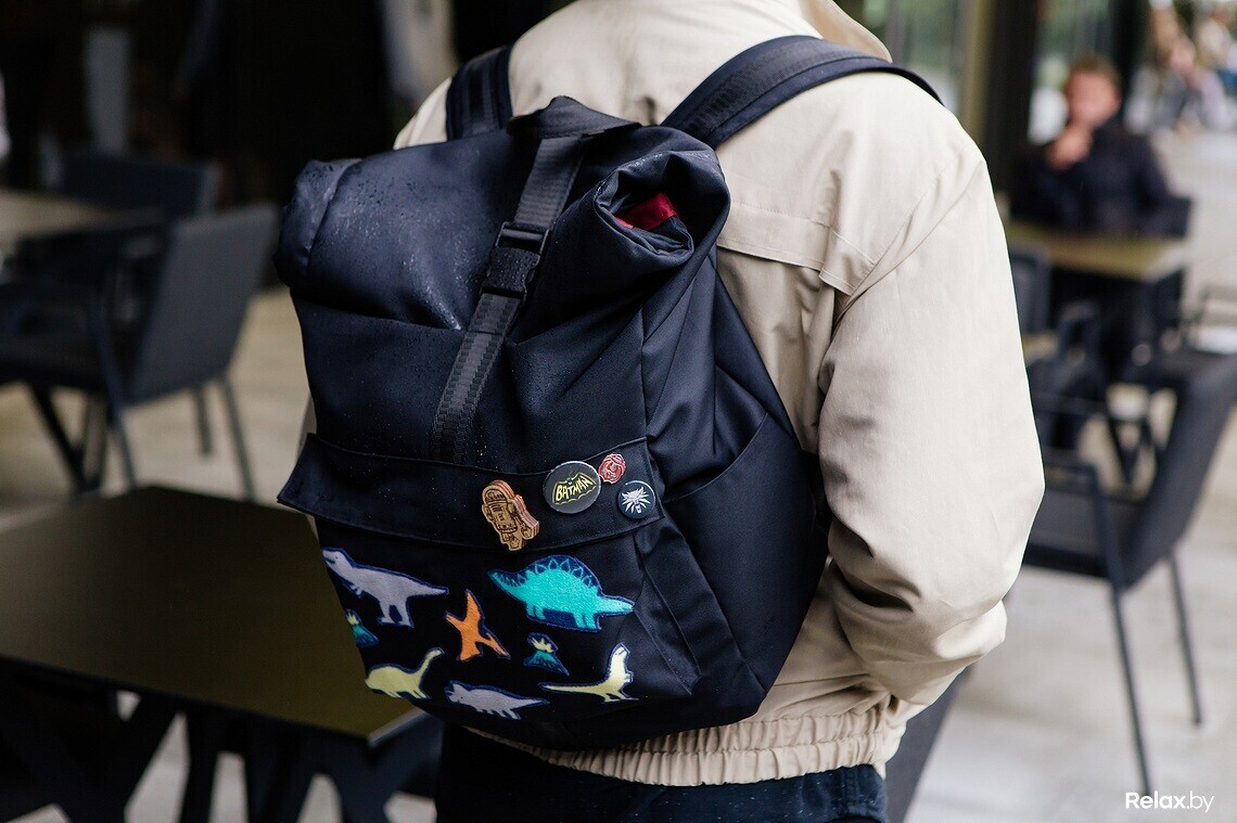 На ногах — винтажные немецкие дерби Lloyd, которые я купил тоже в «секонде» 3 года назад всего за 6 рублей. Носки нашел в Mark Formelle (я большой любитель веселых носков с принтами; обычно покупаю их, когда путешествую, или друзья из разных стран привозят). Рюкзак новый, шился на заказ (с детства обожаю динозавров). Все, что на нем, куплено в минском магазине комиксов time to be a hero. Очки давно встретил в ТЦ «Силуэт».