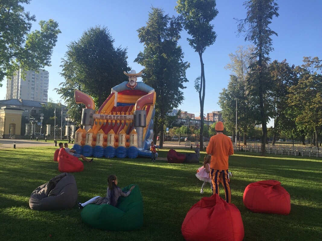 кататься на надувных горках и качелях, играть в песочнице и лазить по