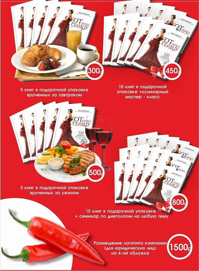 Свою первую кулинарную книгу под названием «От перца к сердцу» светская львица и врач-диетолог Ирина Кабасакал писала три с половиной года: создательница утверждает, что весь процесс (от покупки продуктов до приготовления, фотосъемки и написания рецептов) пройден ею лично. Сбор средств на ее издание запущен на
