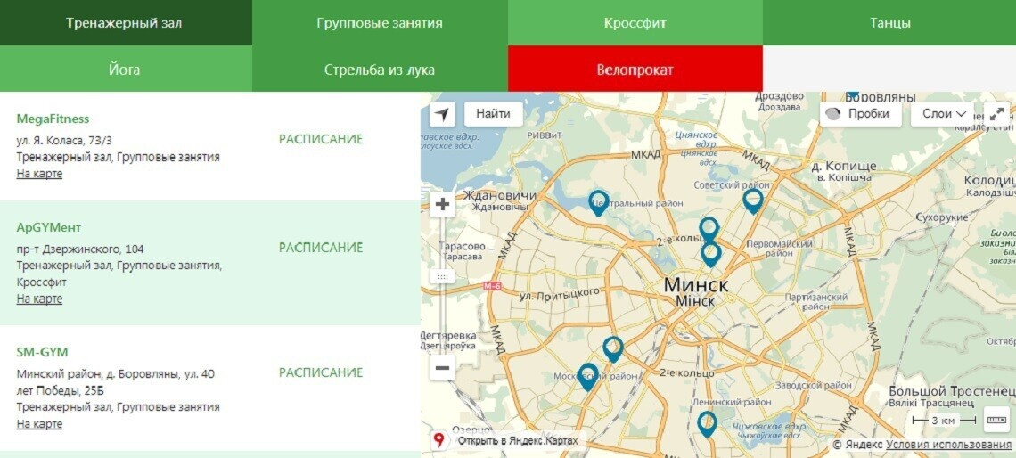 Чтобы понять, в какие залы можно попасть по такому абонементу, можно посмотреть карту на сайте. Есть абонементы на 3, 8 или 12 занятий. Они действуют 30 («Старт») или 60 дней.