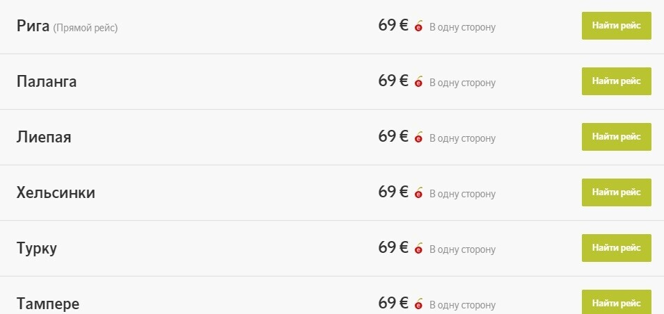 За 69 евро можно слетать из Минска в Ригу, Варшаву, Вильнюс, Палангу, Стокгольм, Тампере, Турку и Хельсинки. За 75 евро можно добраться до Берлина, Гамбурга, Киева, Мюнхена, Парижа или Праги. За 85 евро – в Амстердам, Брюссель, Вену, Москву, Санкт-Петербург и Фракфурт-на-Майне. В Тбилиси и Абу-Даби по акции можно долететь за 159 евро, а в Копенгаген и Осло – за 169 евро. При этом все рейсы – с пересадкой, кроме полета в Ригу.