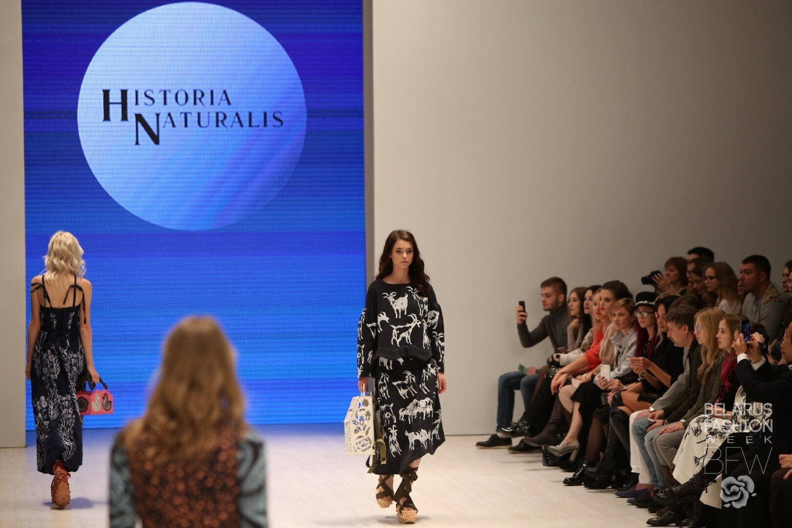 Показ Historia Naturalis. «Веска» представляет собой микс из натуральных тканей, принта и их творческой обработки. В принтах присутствуют фигурки коз и уток и растительные мотивы.