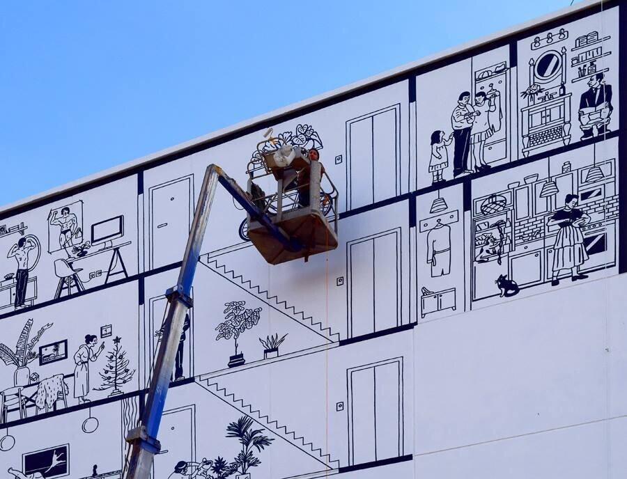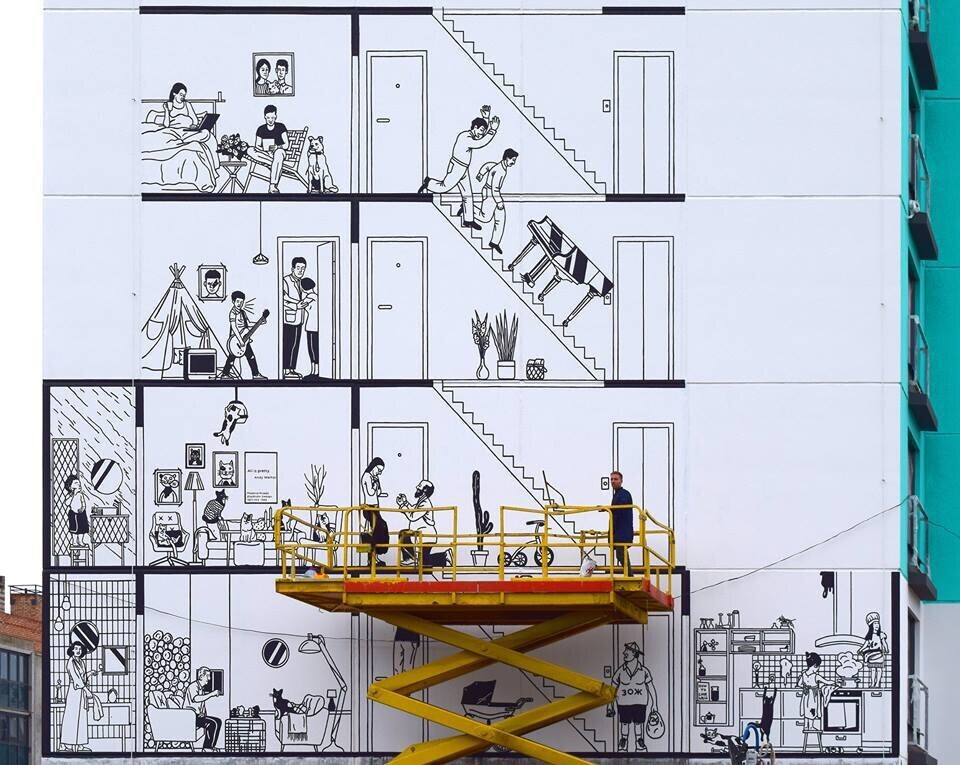 Основой для стритарт-работы стали бытовые сюжеты с долей юмора. Например, можно заметить двух мужчин, бегущих по лестнице за падающим роялем, музицирующего ребенка, родители которого страдают от шума, или квартиру, полную кошек.