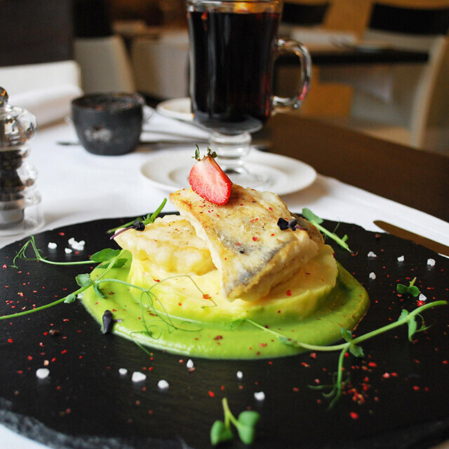 Судак с пюре из цветной капусты и зеленого горошка