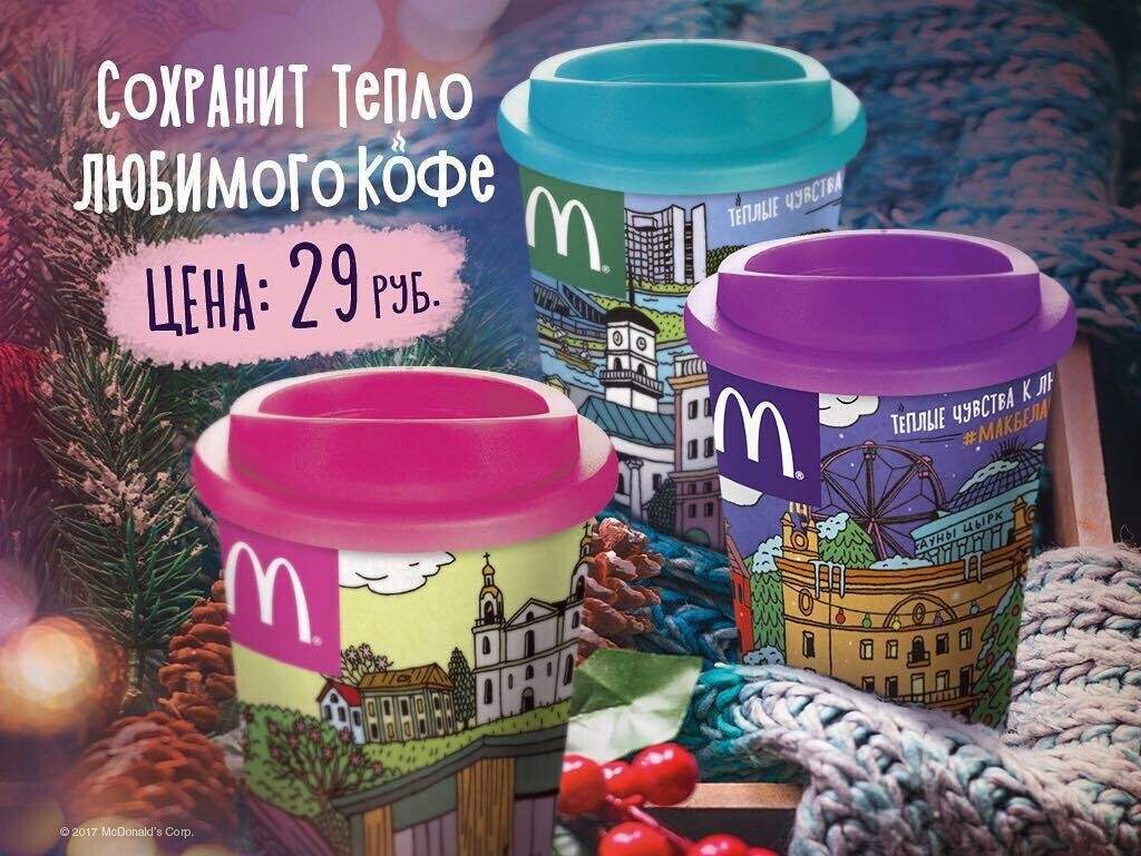 В ресторанах сети McDonald’s начали продавать термокружки с дизайнерскими рисунками. Принты от художника Мити Писляка сначала появились на стаканчиках для кофе, а теперь стали основой для дизайна термокружек.