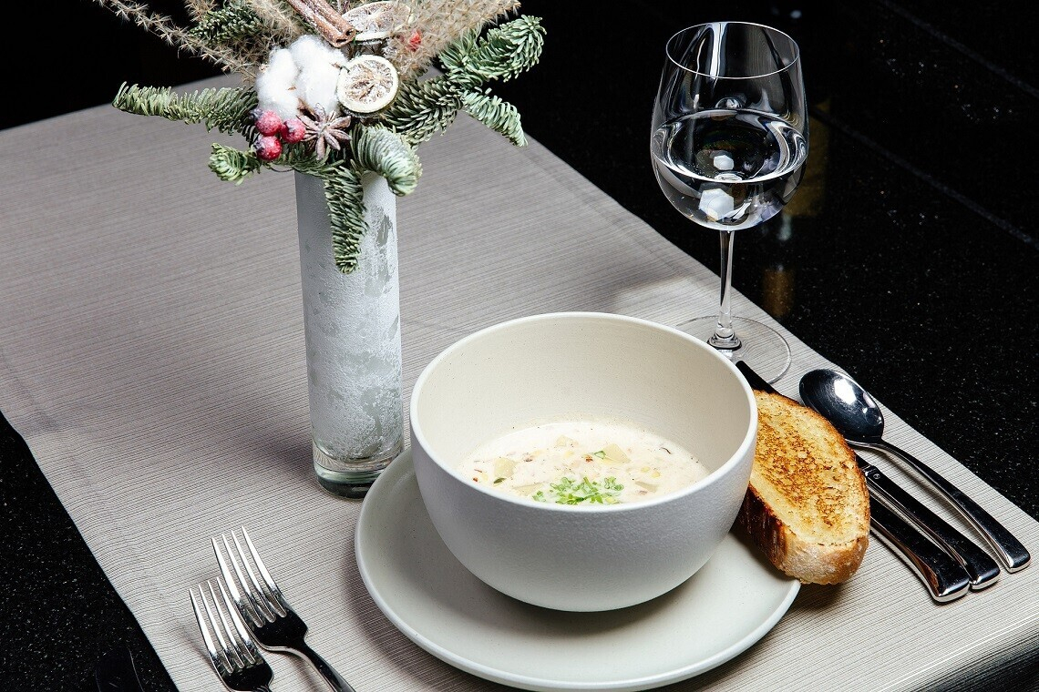 Ужин или обед начнется с блюда, знакомого каждому жителю США с детства, — чаудера со сливками, мидиями и картофелем. В суп повара добавляют кусочки филе трески собственного копчения. К чаудеру подают обжаренный хлеб, чтобы гость макал его прямо в густой суп.