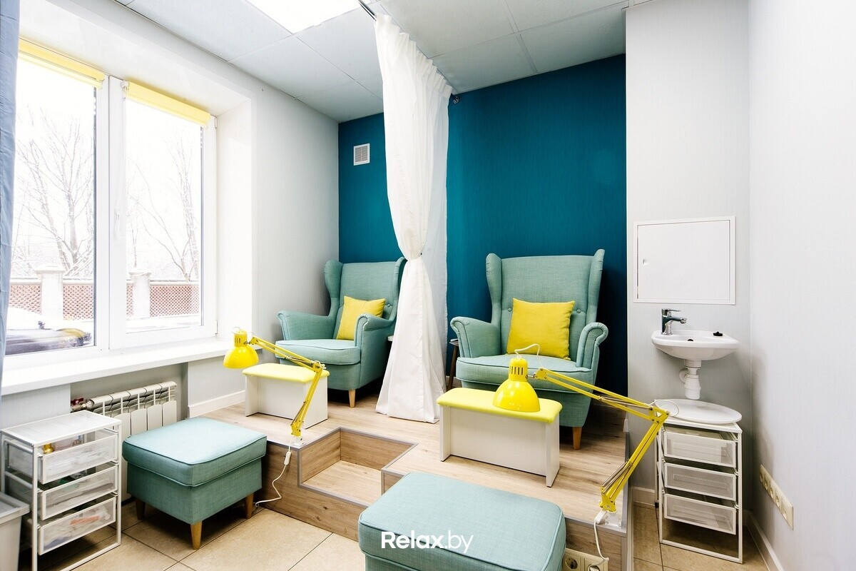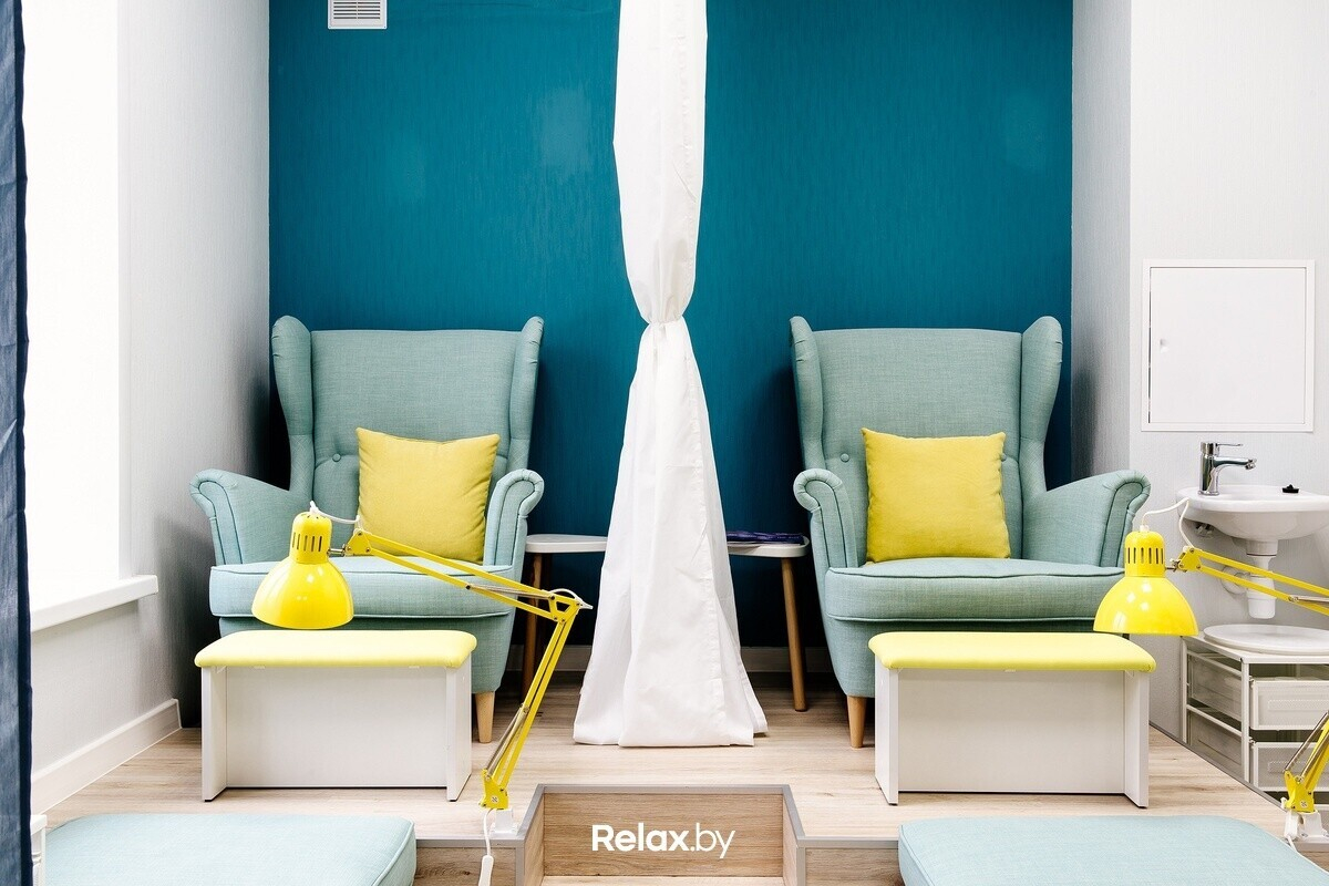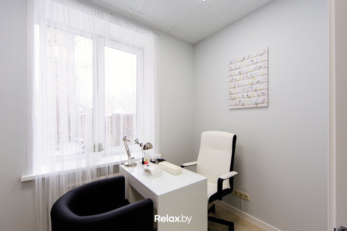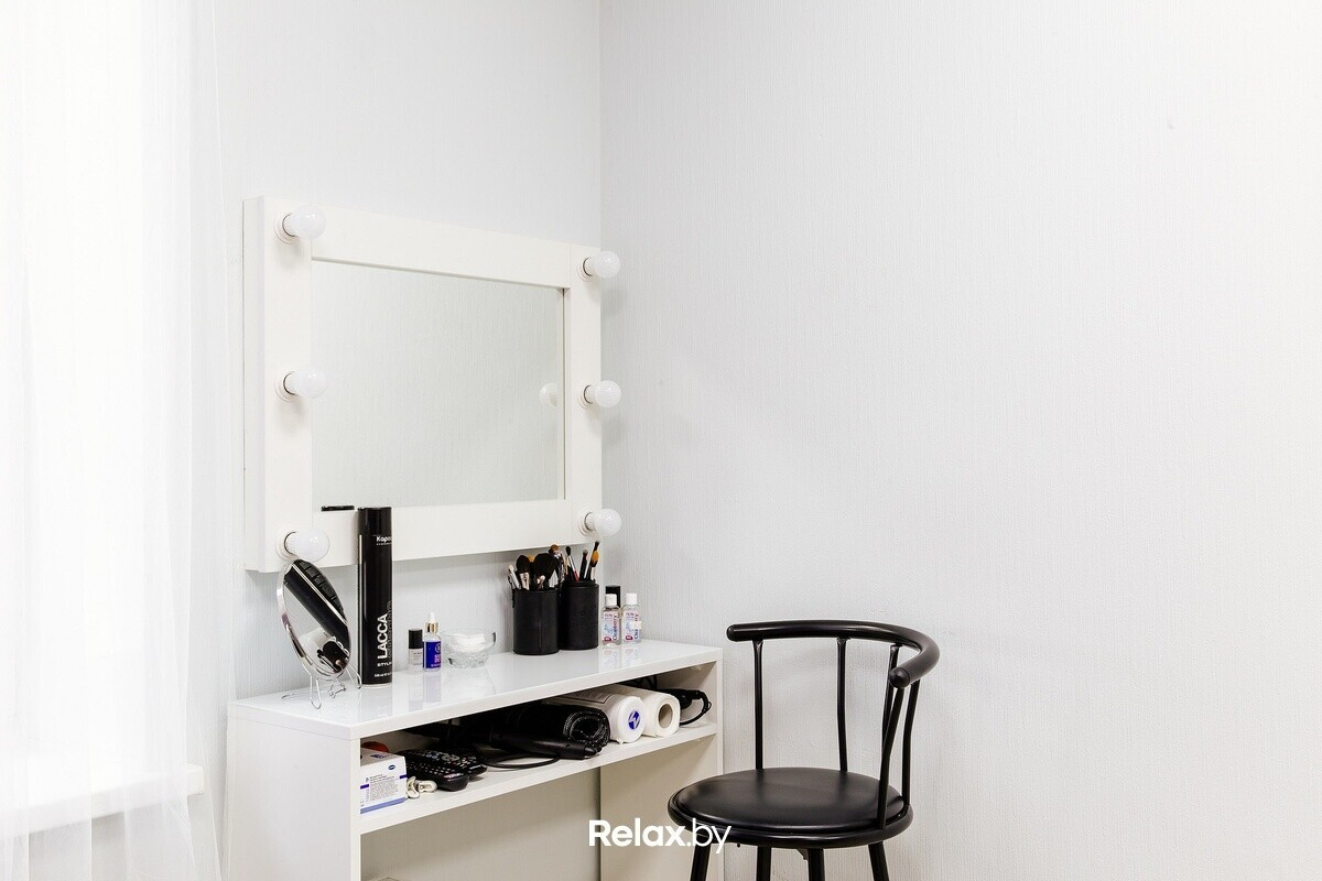 Интерьер студии выполнен в светлых тонах со стильными яркими акцентами. Одна из стен покрыта грифельной краской — на ней постоянно обновляются рисунки, каждый клиент может написать мелом пожелания салону. Мебель изготовлена на заказ, в уютных креслах удобно сидеть на протяжении всех процедур.