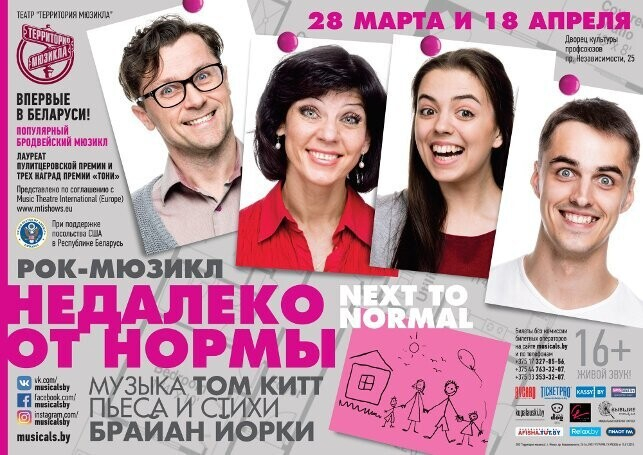 Премьеру лицензионного бродвейского рок-мюзикла «Недалеко от нормы» представит минский театр «Территория мюзикла» 28 марта и 18 апреля, сообщает БЕЛТА.