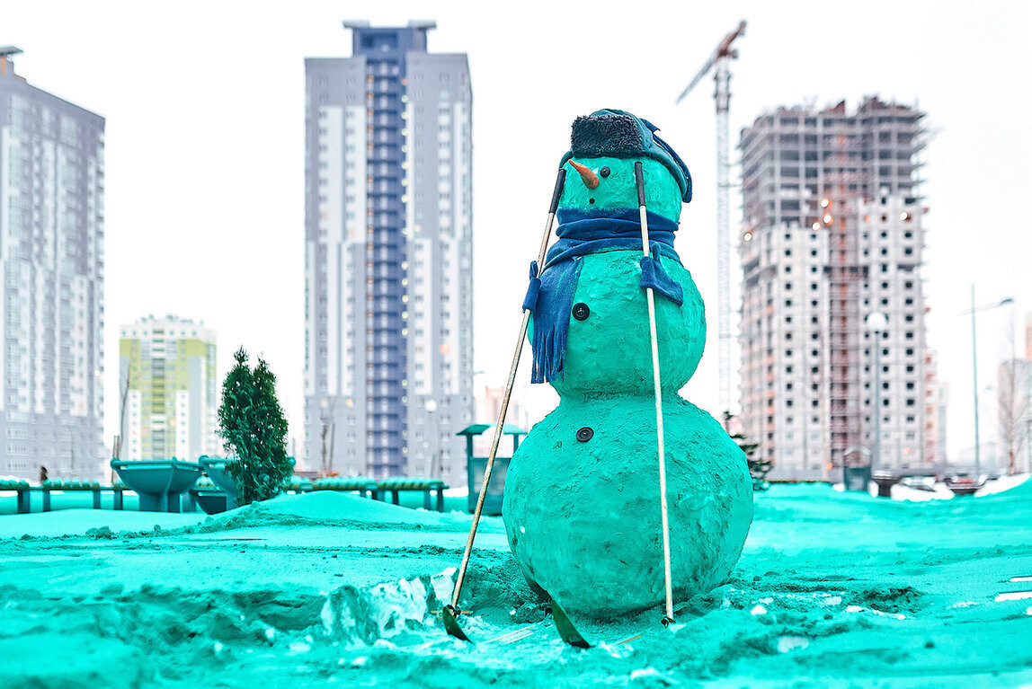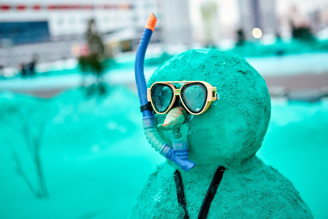 Сегодня снег у минских университетов окрасился в бирюзово-мятный цвет, а вблизи учебных корпусов и общежитий появились странные фигуры в виде снеговика-панка и снеговика-аквалангиста.