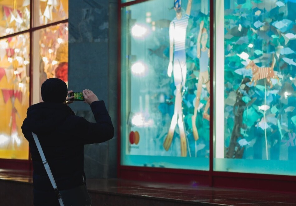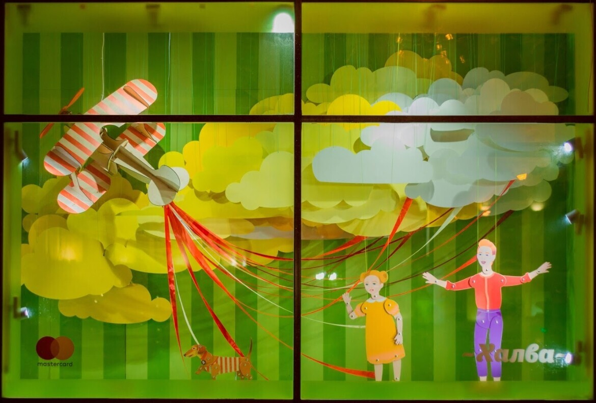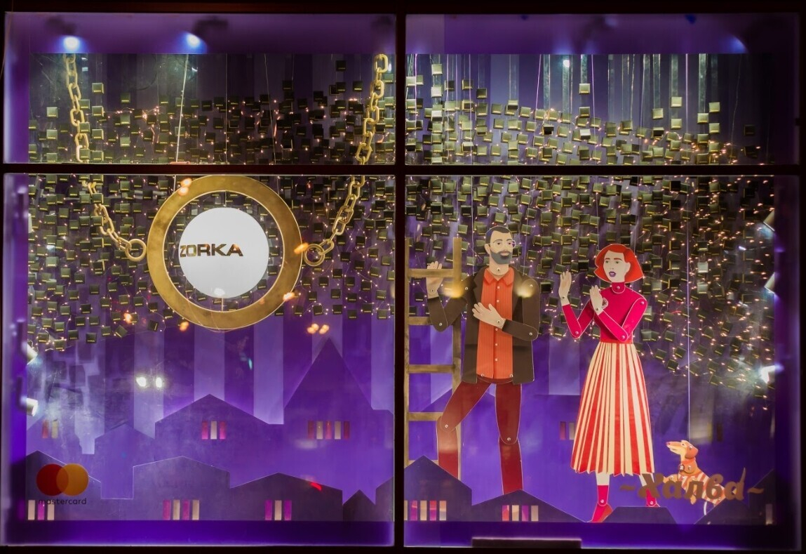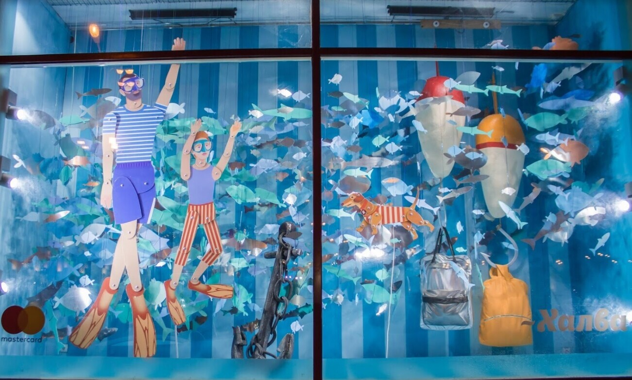 Каждая витрина имеет свою тематическую отсылку к определенному месяцу сезона. Герои экспозиции встречают весну, гуляют по летнему парку, занимаются дайвингом, отправляют детей в школу, вдохновляются звездным небом на романтическом свидании, ходят в кино.